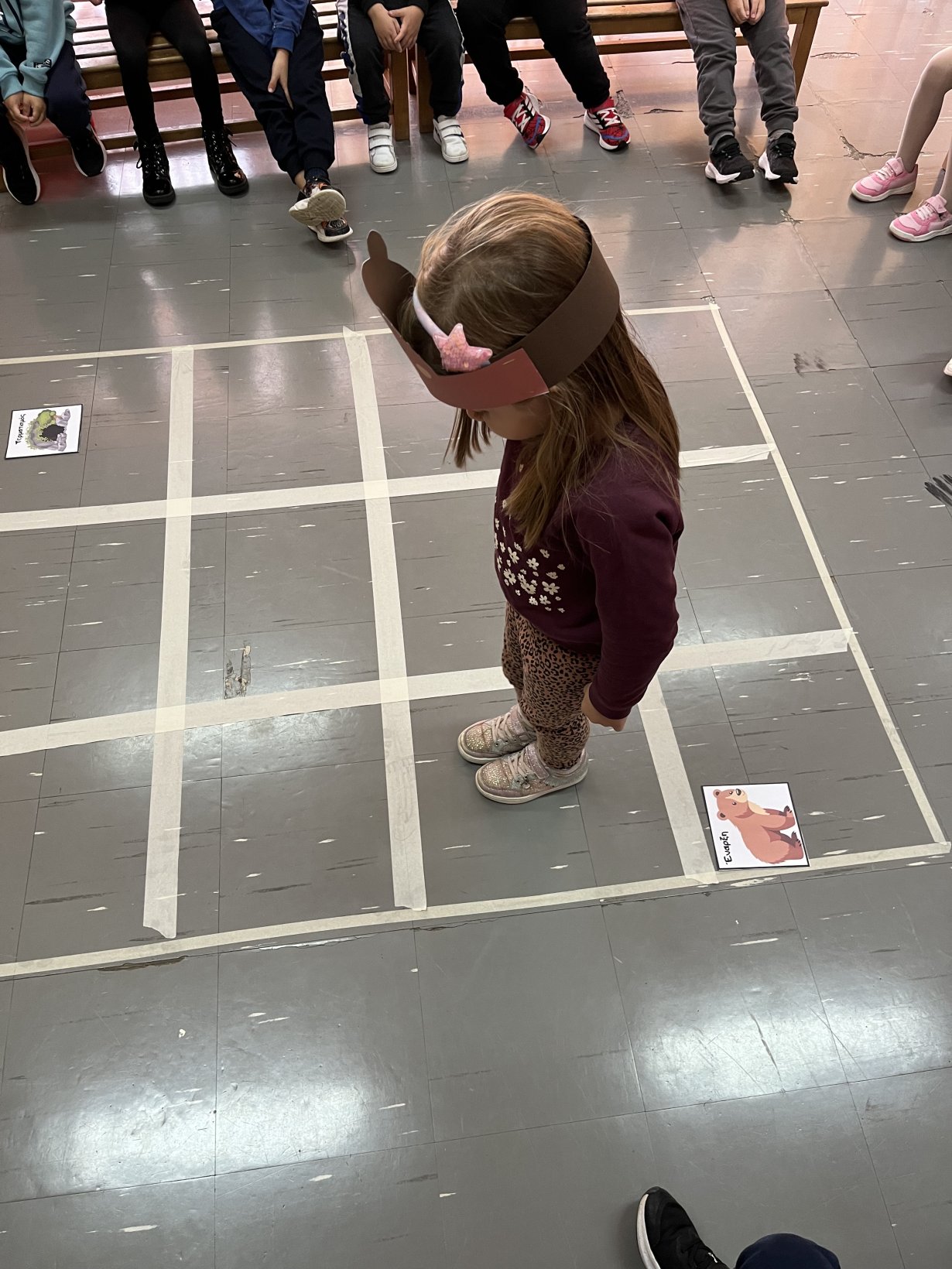 Στο δάπεδο έχουμε ετοιμάσει ένα τετραγωνισμένο πλαίσιο 12 τετραγώνων 3Χ4 . Αναπαριστά το δάσος με τη φωλιά της αρκουδίτσας. Το σενάριο λέει ότι η αρκουδίτσα έχασε τη φωλιά της και πρέπει να τη βοηθήσουμε να τη βρει.