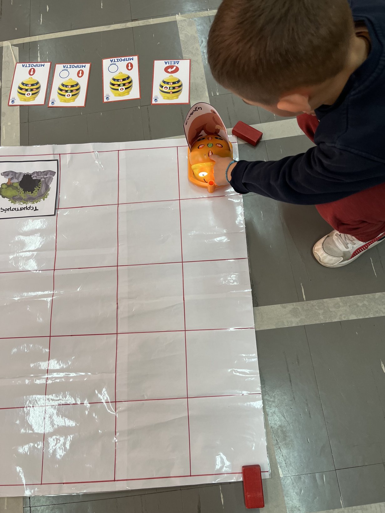 Το ένα τετράγωνο είναι η αφετηρία, όπου ξεκινά η αρκουδίτσα και σε ένα άλλο η φωλιά. Τα παιδιά πρέπει να τοποθετήσουν στο πάτωμα τα βελάκια κατεύθυνσης και να “προγραμματίσουν” το παιδί αρκουδάκι να φτάσει στη φωλιά του.