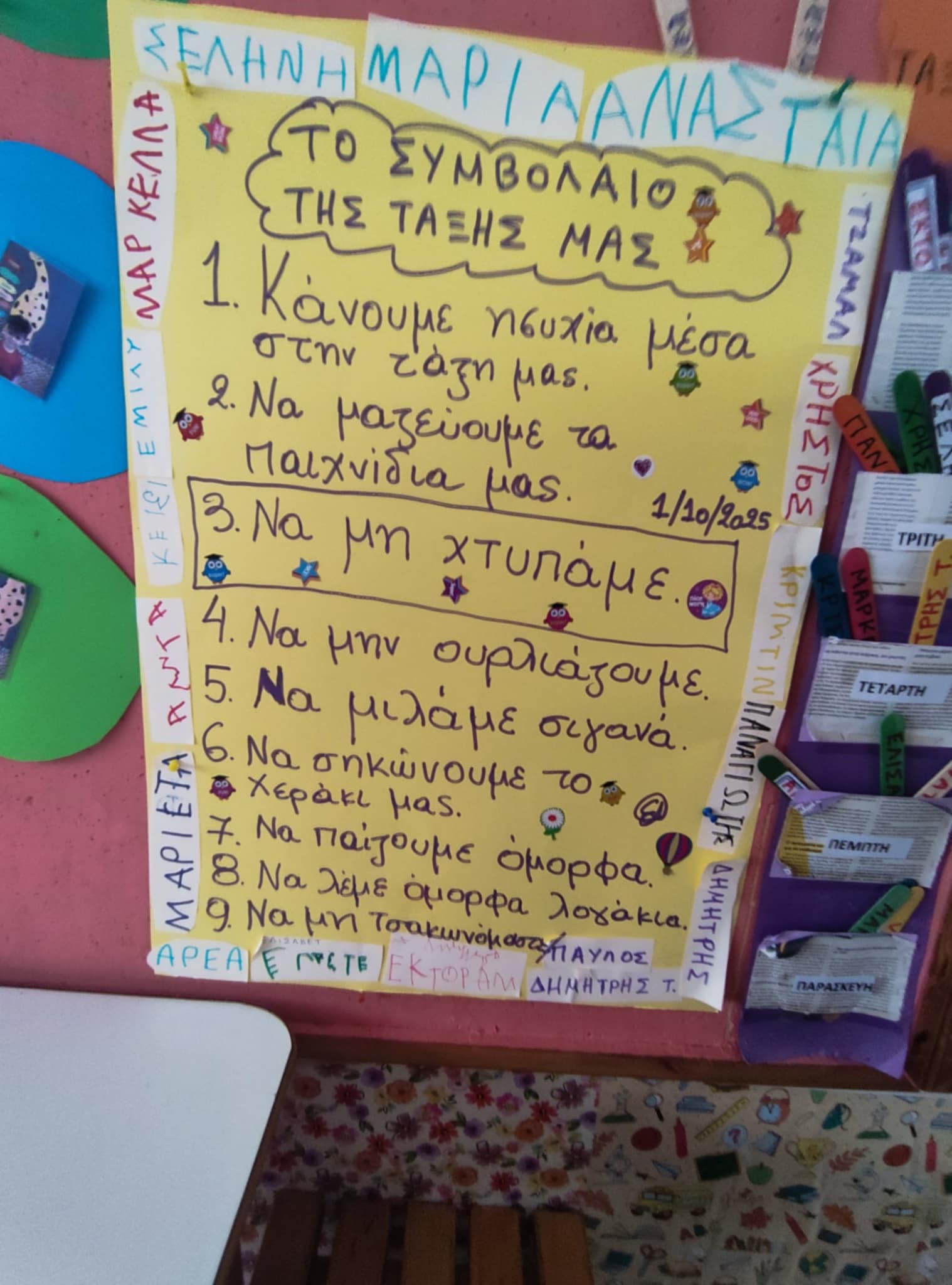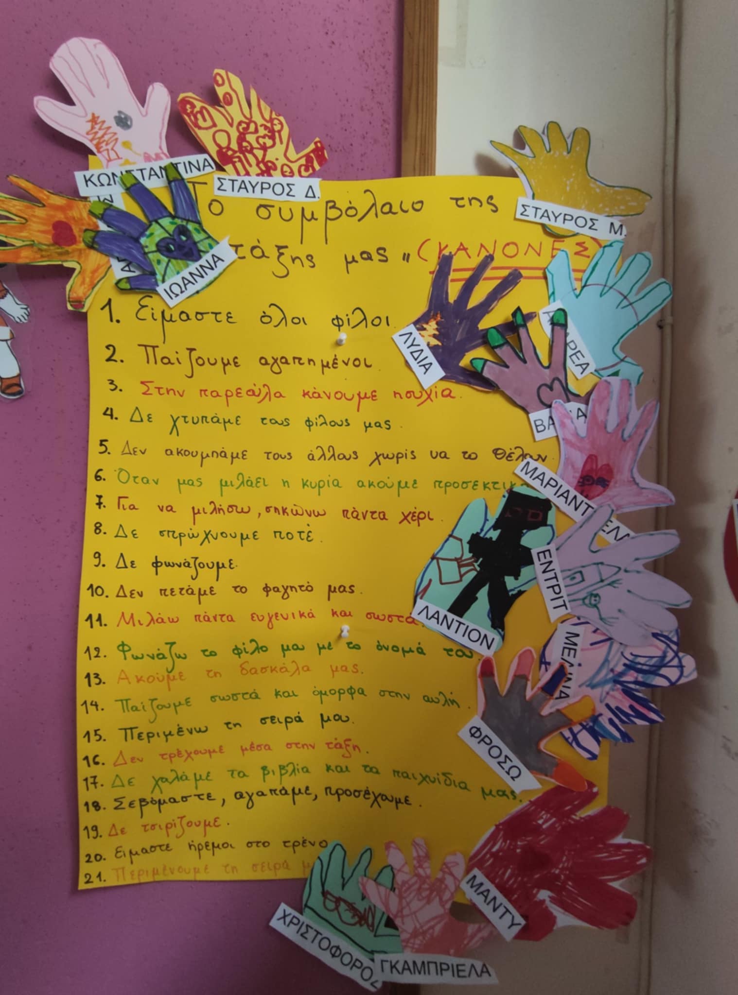 Στη συνέχεια οργανώσαμε τους κανόνες της τάξης μας και φτιάξαμε το συμβόλαιο συμφωνίας, όπου το υπογράψαμε με τις παλάμες μας