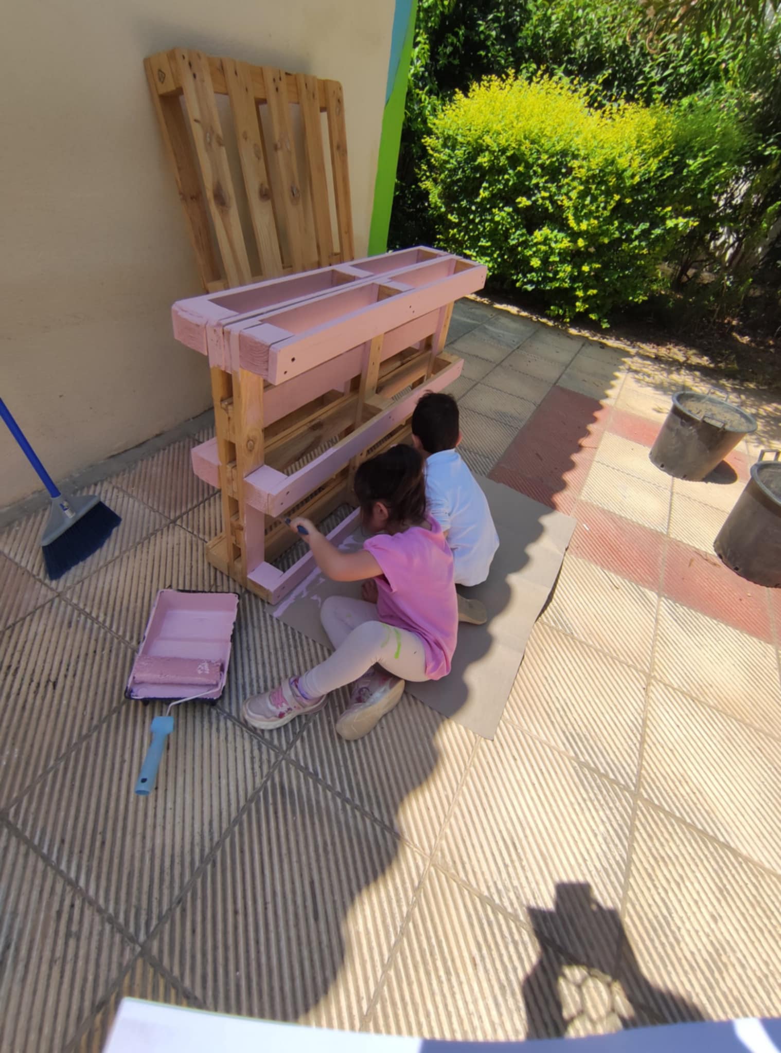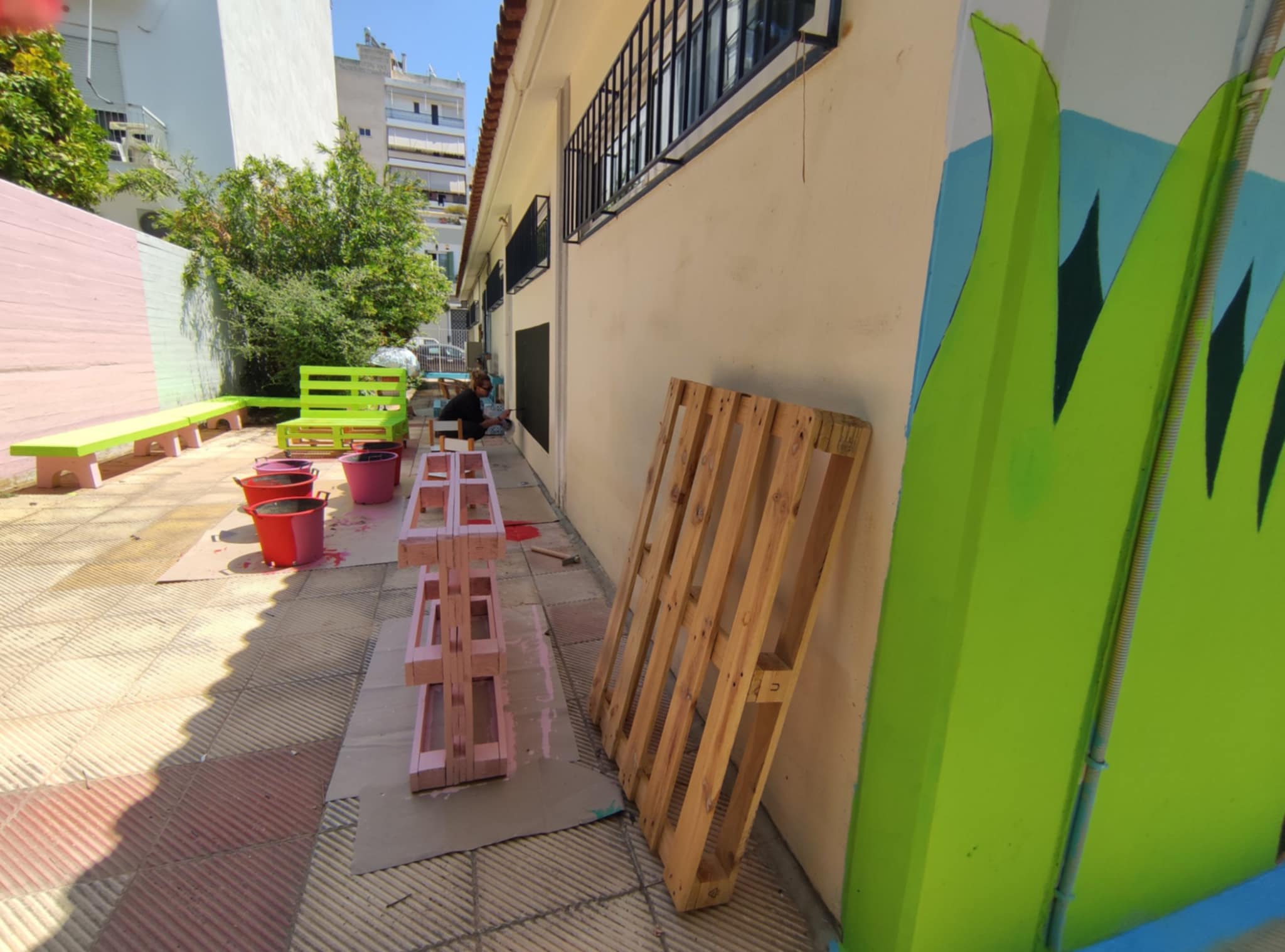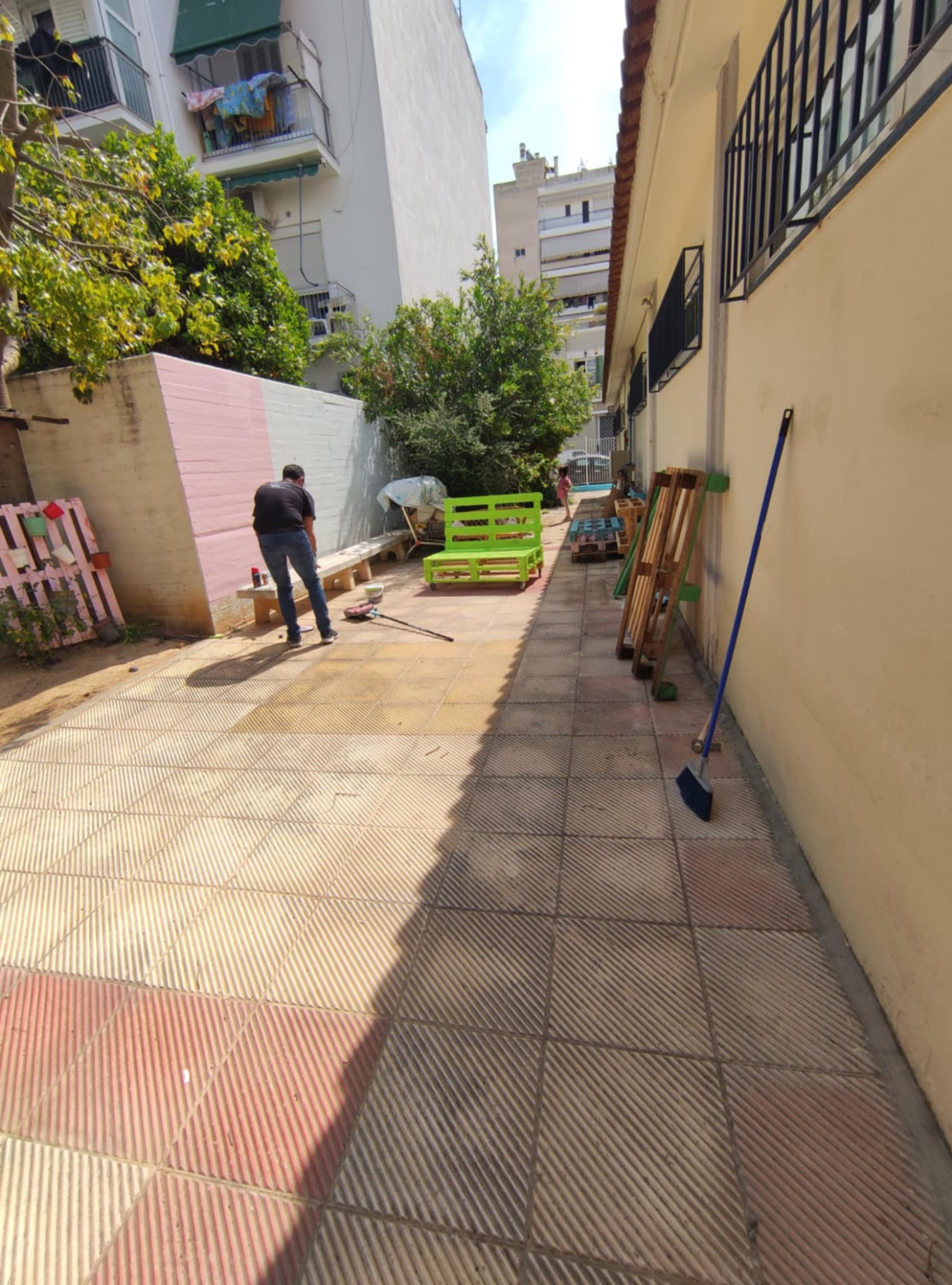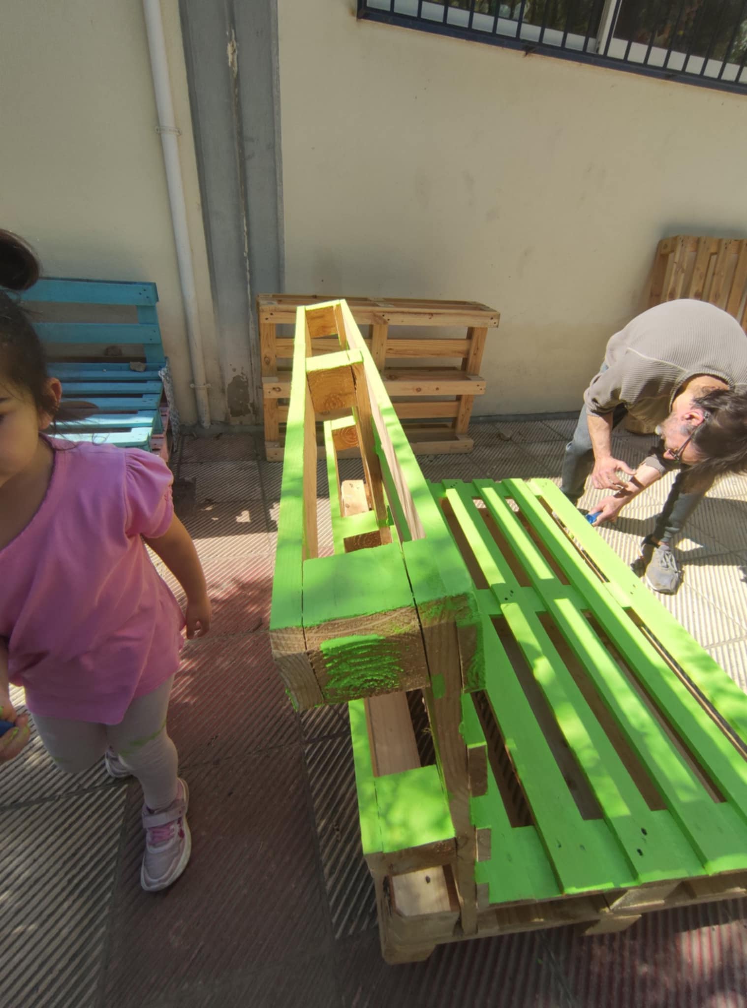 2Η Ομάδα νηπίων: βάψιμο των σταθμών εργασίας, καναπές, υπαιθρια βιβλιοθήκη, γωνιά ζωγραφικής, μαυροπίνακας στον εξωτερικό τοίχο, αυτοσχέδιο πειρατικό καράβι.