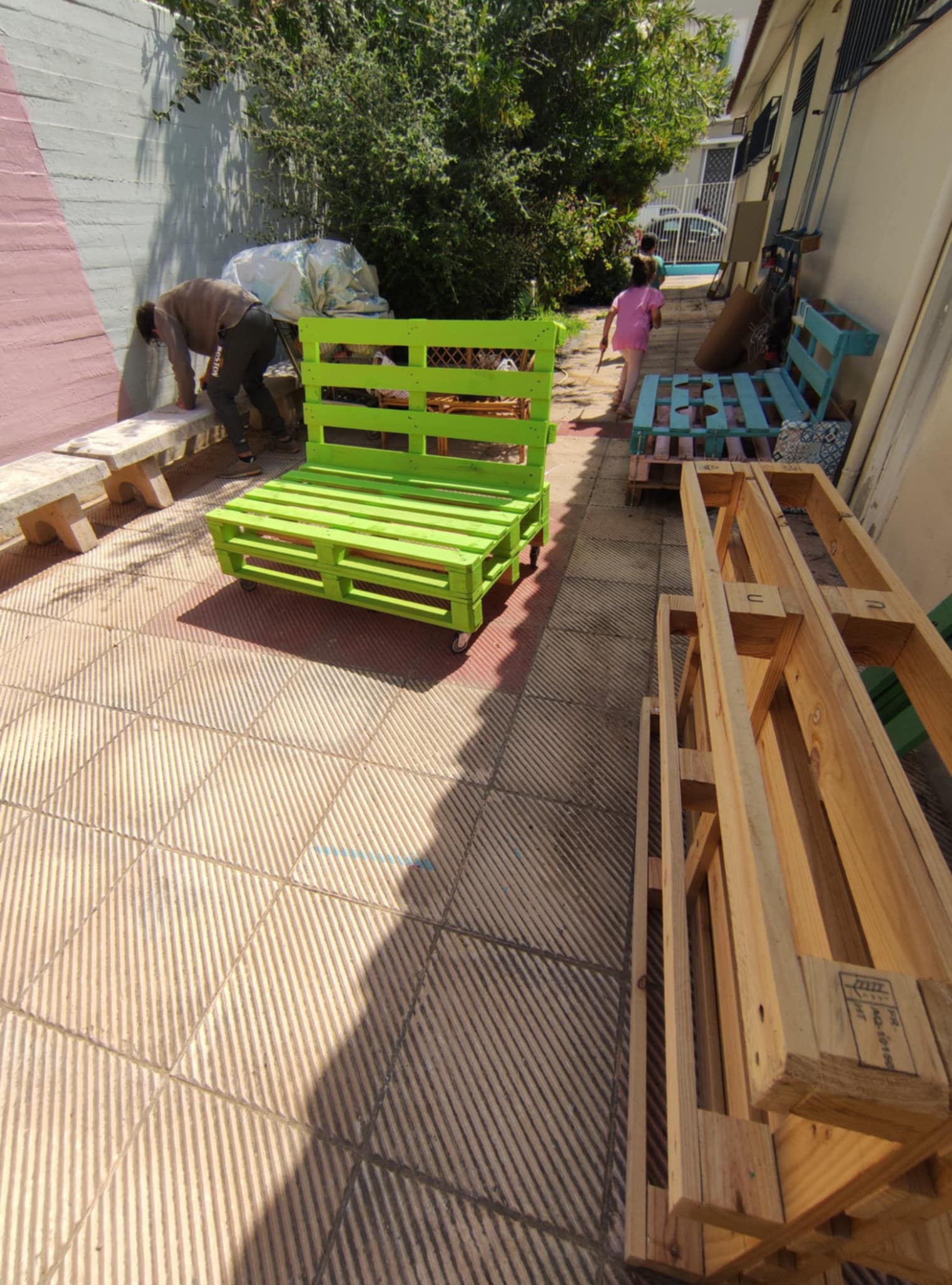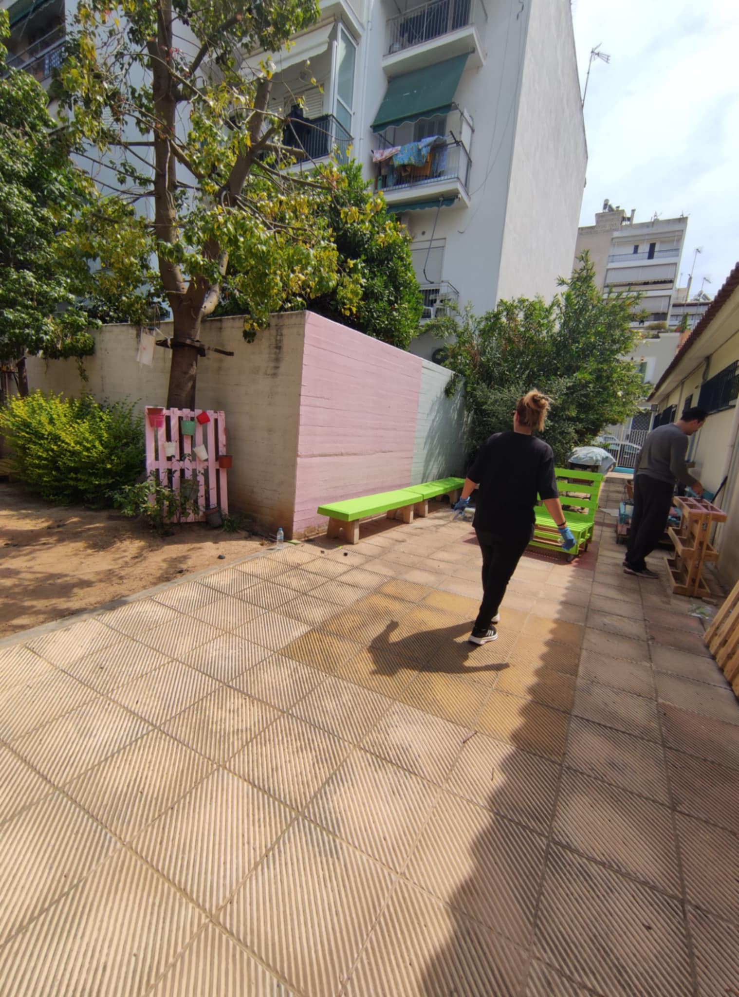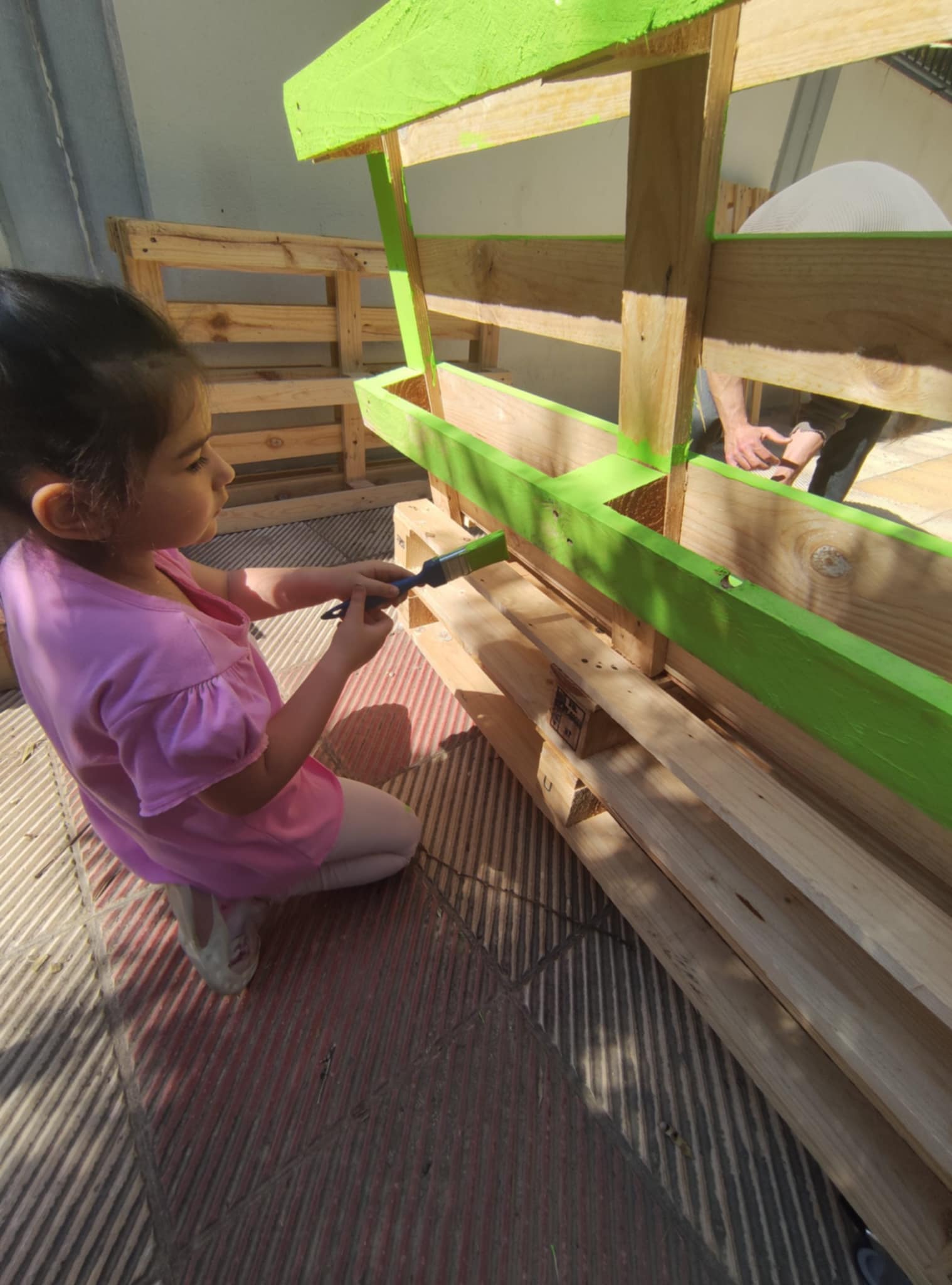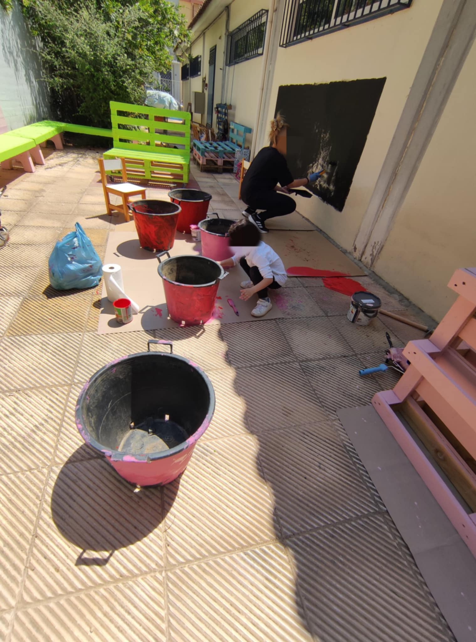 2Η Ομάδα νηπίων: βάψιμο των σταθμών εργασίας, καναπές, υπαιθρια βιβλιοθήκη, γωνιά ζωγραφικής, μαυροπίνακας στον εξωτερικό τοίχο, αυτοσχέδιο πειρατικό καράβι.