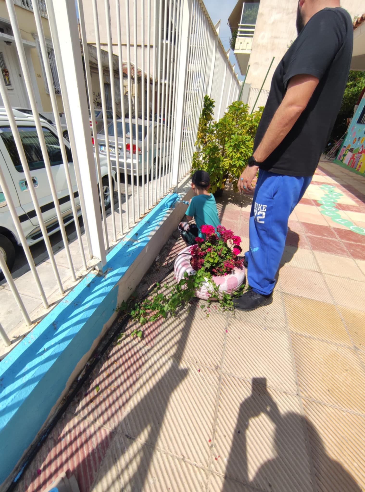 Ζωγραφίζουμε τις γλάστρες και φυτεύουμε θαμνους και αρωματικά φυτά στην πρόσοψη του Νηπιαγωγείου.