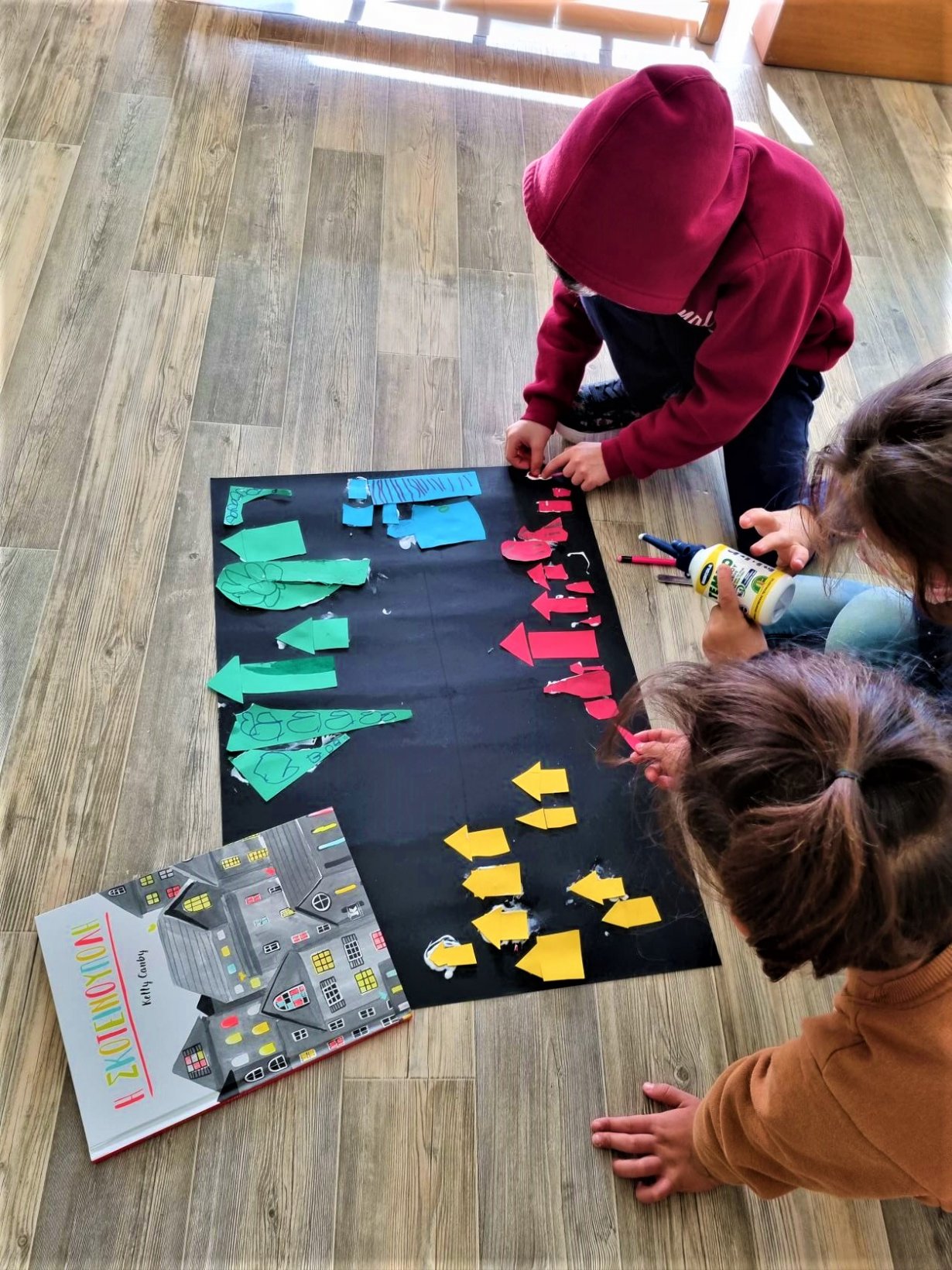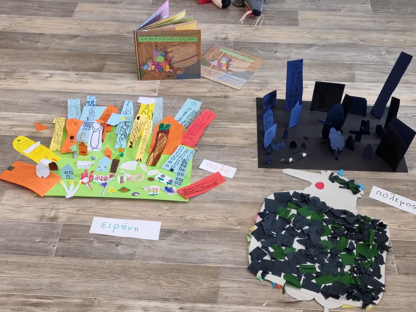 Και φτιάξαμε τον Πόλεμο και τον Ειρήνο. Μαύρος και άσχημος ο Πόλεμος, με λουλούδια και χρώματα ο Ειρήνος. Και την πόλη της Χαράς με τα μεγάλα και όμορφα σπίτια , με δρόμους, πλατείες και πολλά παιδιά φτιάξαμε. Και την πόλη όπως την κατάντησε ο Πόλεμος, μαύρη, γκρεμισμένη και χωρίς …χαρά!