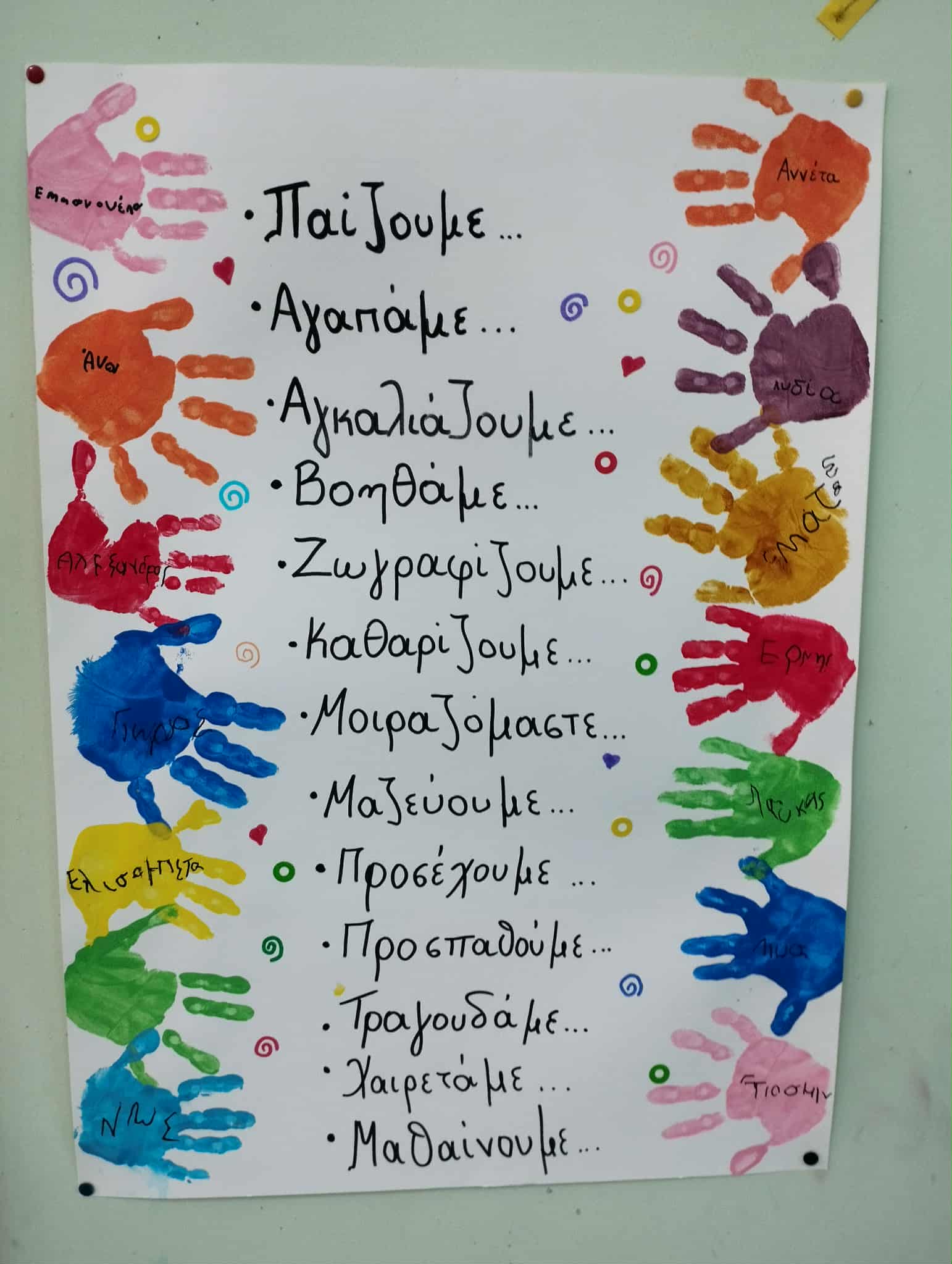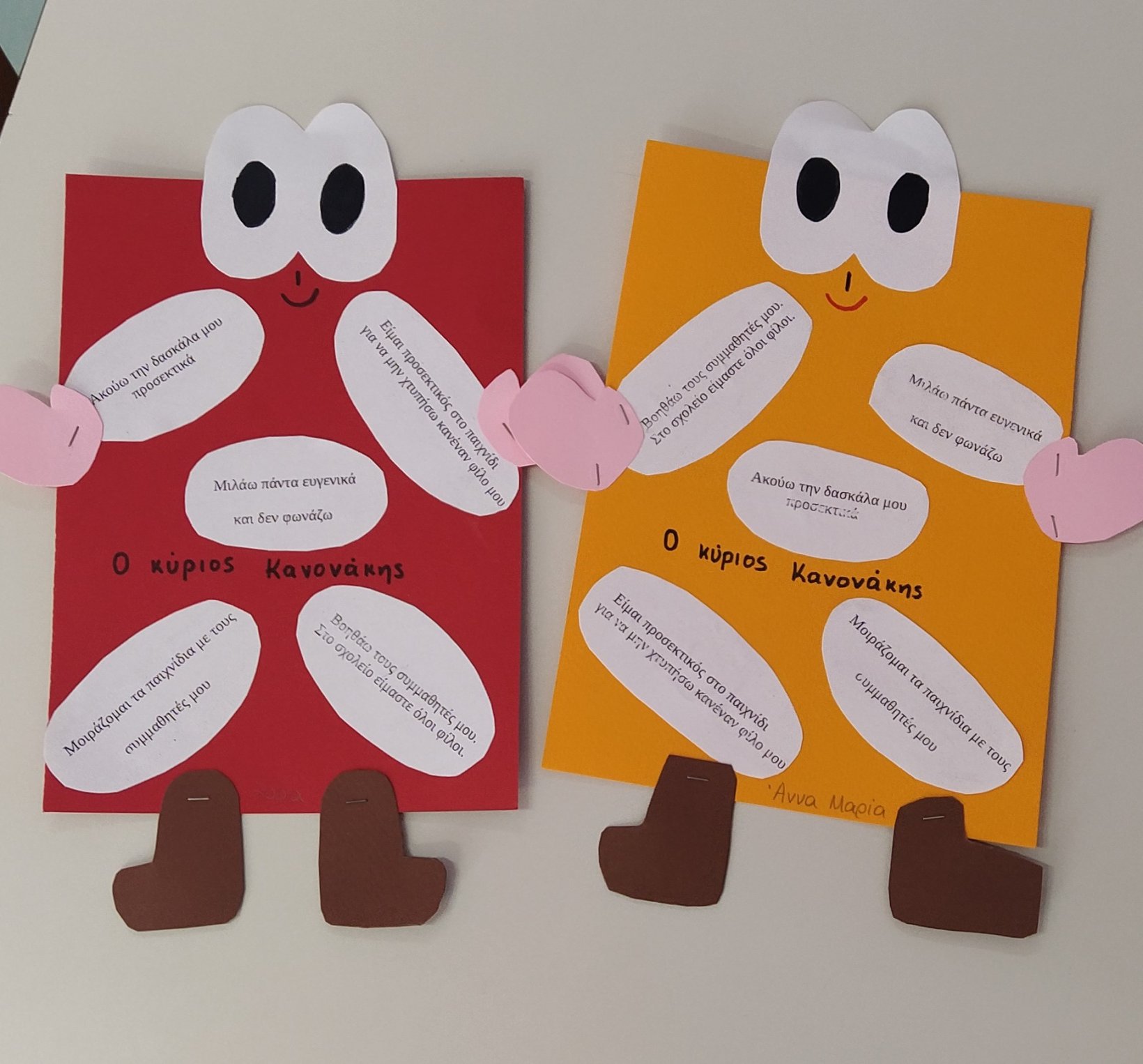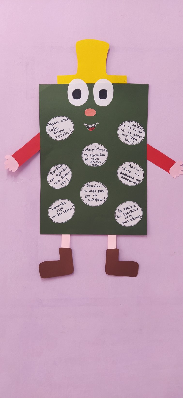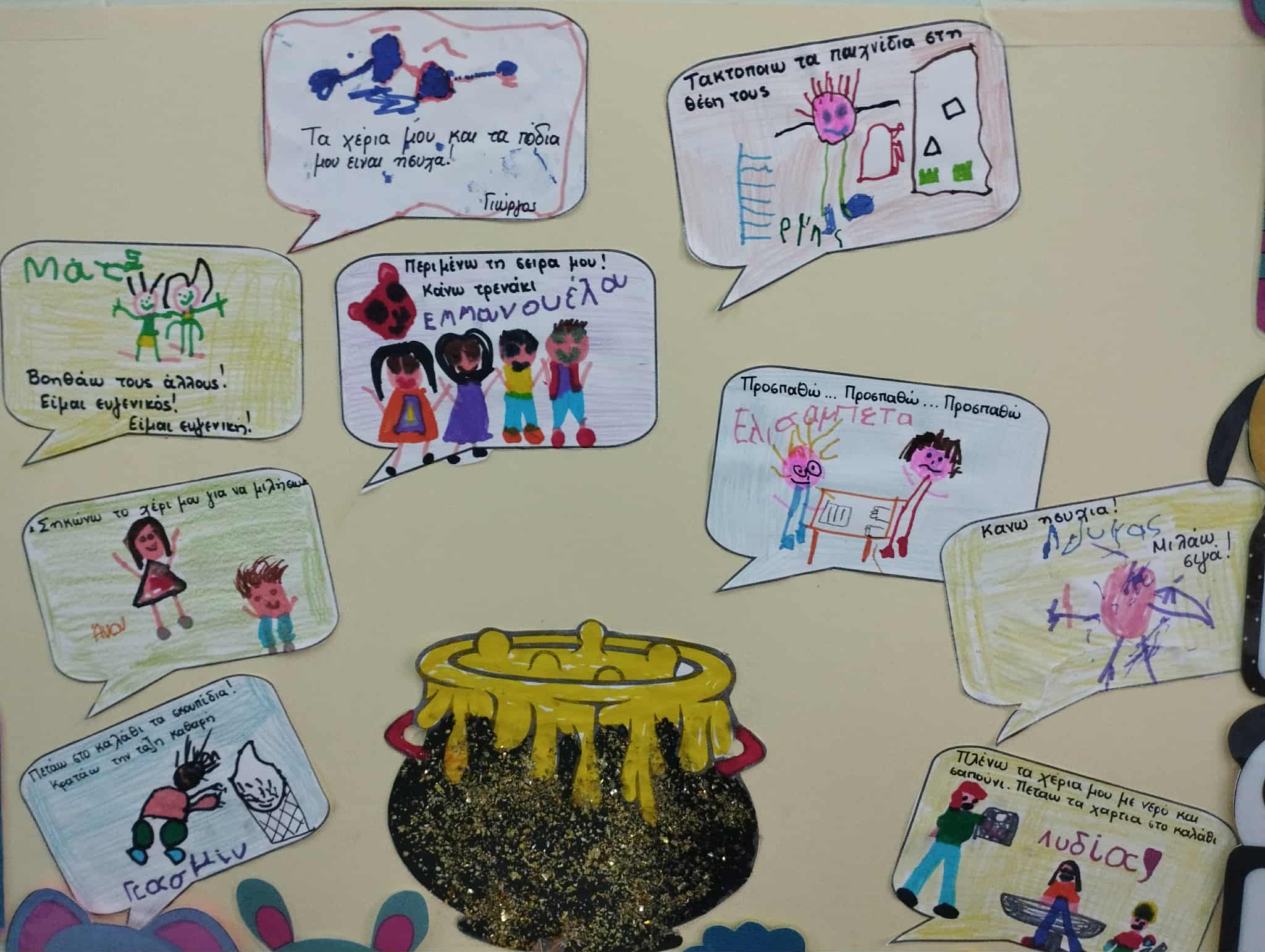 Γι’αυτό τον σκοπό κι εμείς γίναμε μάγοι και φτιάξαμε το δικό μας μαγικό φίλτρο που περιέχει τους κανόνες του σχολείου και σκορπίζει χαρά σε μικρούς και μεγάλους όταν τους ακολουθούν. Αναπαραστήσαμε σε χαρτί τους κανόνες με την βοήθεια των μικρών μας ζωγράφων, ομαδοποιήσαμε εικόνες συμπεριφορών σε θετικές και αρνητικές, φτιάξαμε τον “Κύριο Κανονάκη” που υπερ-αγαπά τους κανόνες και θέλει να μας τους υπενθυμίζει με κάθε ευκαιρία, καλέσαμε στην τάξη μας την νεράιδα Ευγενία για να μας μάθει γλυκά λογάκια και ευγενικές λεξούλες ώστε να μιλάμε πάντα ευγενικά και να κάνουμε τους γύρω μας χαρούμενους, τοποθετήσαμε εικόνες των κανόνων σε περίοπτη θέση μέσα στις τάξεις μας για να μην τους ξεχνάμε και διασκεδάσαμε πραγματικά με όλες αυτές τις όμορφες ιδέες.