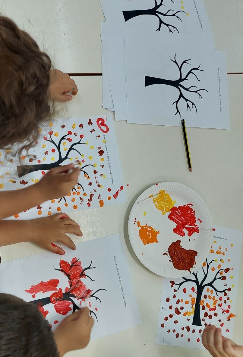 Το προηγούμενο διάστημα ασχοληθήκαμε με το Φθινόπωρο. Μιλήσαμε με τα παιδιά για τις αλλαγές της φύσης, των καιρικών συνθηκών, για την προετοιμασία των ζώων για το χειμώνα και για τις αλλαγές των συνηθειών των ανθρώπων. Είδαμε τα φθινοπωρινά φρούτα, μάθαμε τα ρούχα και τα αξεσουάρ που χρησιμοποιούμε αυτή την εποχή, διασκεδάσαμε χορεύοντας και τραγουδώντας. Γνωρίσαμε το «Φ» του Φθινοπώρου και το «Ο» του Οκτώβρη και τα εντάξαμε στις εργασίες μας αξιοποιώντας την φαντασία μας. Επίσης, παρατηρήσαμε τα χρώματα που επικρατούν το φθινόπωρο στη φύση, τα δέντρα που ρίχνουν τα φύλλα τους και επικεντρωθήκαμε σε αυτά στις εργασίες μας. Τα παιδιά εμπνεύστηκαν και έφτιαξαν υπέροχες καλλιτεχνικές δημιουργίες.