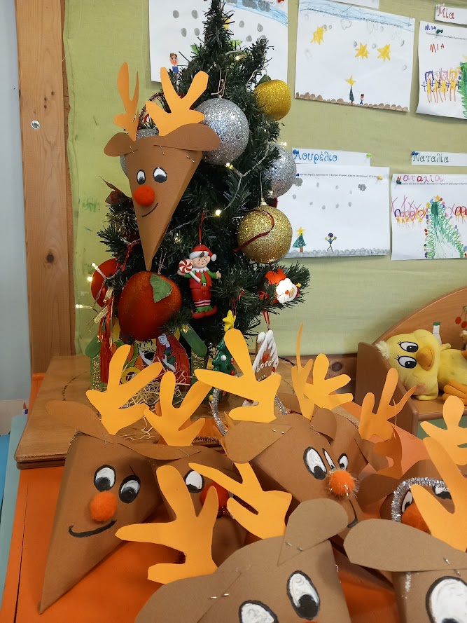 Το κάθε παιδί χρωματίζει μια μπάλα αλουμινένια . Φτιάχνουμε το δέντρο. Ένα παιδί διαλέγει τον αριθμό της ημερομηνίας (ο κάθε αριθμός αντιστοιχεί σε ένα παιδί και υπάρχει και μια γραπτή οδηγία) , η νηπιαγωγός καλεί το παιδί που επιλέχθηκε να πάει σε ένα συγκεκριμένο μέρος της τάξης , εκεί κρύβεται μια έκπληξη – λιχουδιά. Μετά το παιδί κυκλώνει τον αριθμό στο δέντρο.