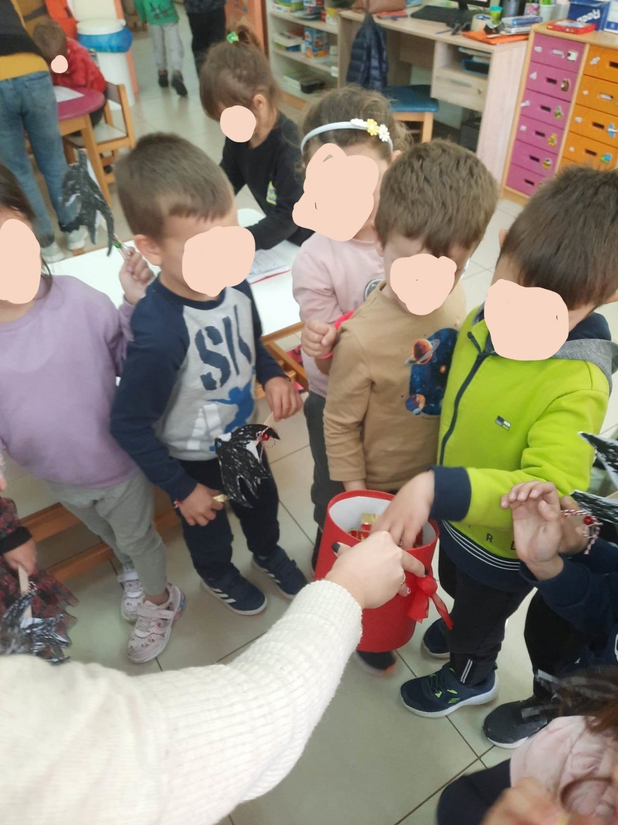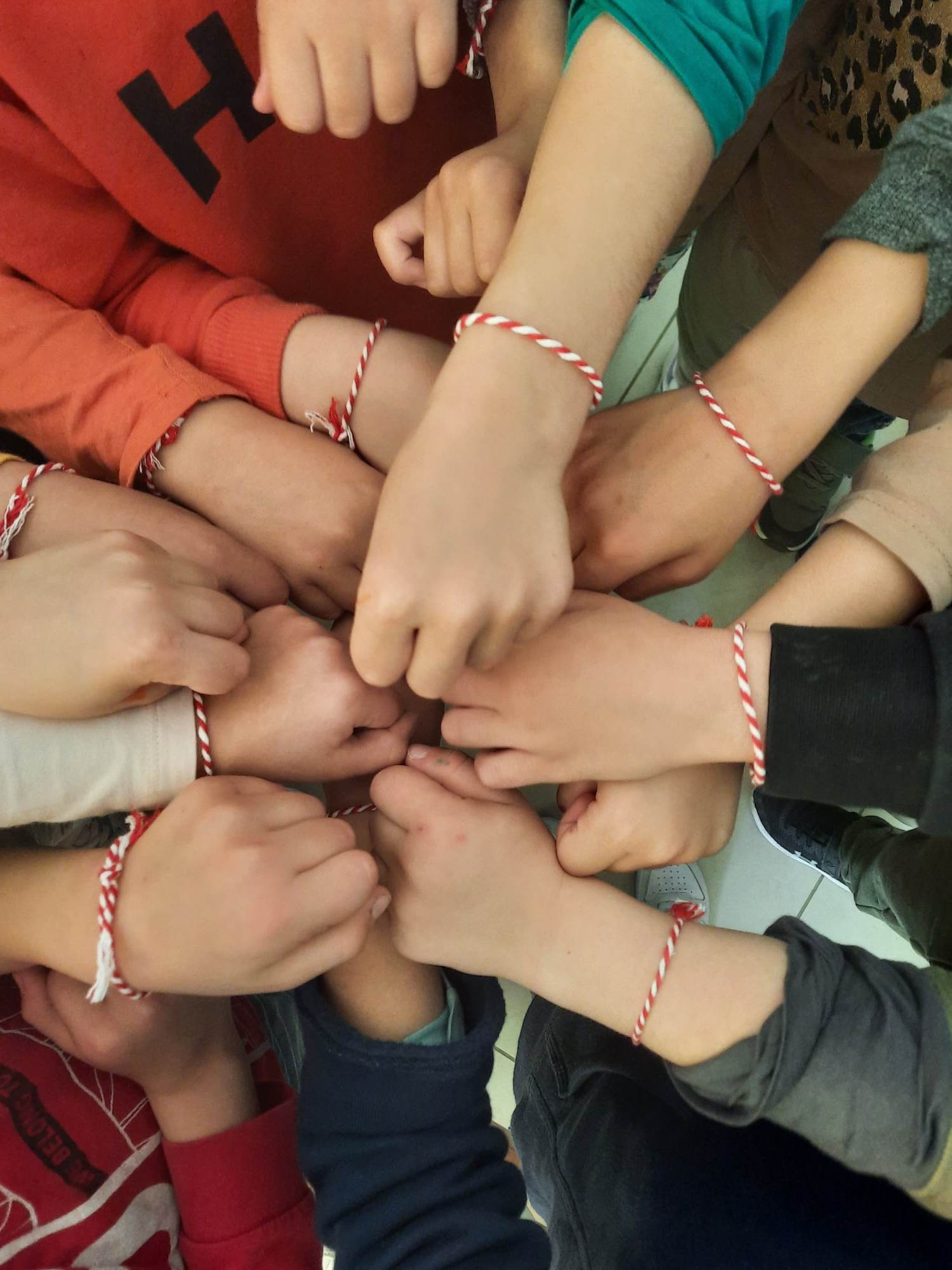 Υπήρχε το πρωί μία έκπληξη από την κυρία. Μας υποδέχτηκε κρατώντας τα «Μαρτάκια» τα οποία μας φόρεσε στο χέρι και μπήκαμε στο Νηπιαγωγείο μας. Ξεκινώντας τις δραστηριότητες μας, μιλήσαμε για το έθιμο του βραχιολιού με την άσπρη και κόκκινη κλωστή που φοράμε στο χέρι ή στο δάχτυλό μας ή στο πόδι μας την 1η μέρα του Μάρτη και τι αυτό συμβολίζει. Γνωρίσαμε ότι δεν φοράμε μόνο εμείς οι άνθρωποι το «Μαρτάκι» αλλά και τα δέντρα και τα ζώα για να έχουν καρποφορία και καλοτυχία. Γνωρίσαμε επίσης μέχρι πότε θα το φοράμε και τι επιλογές έχουμε αφού το αφαιρέσουμε από το χέρι μας.