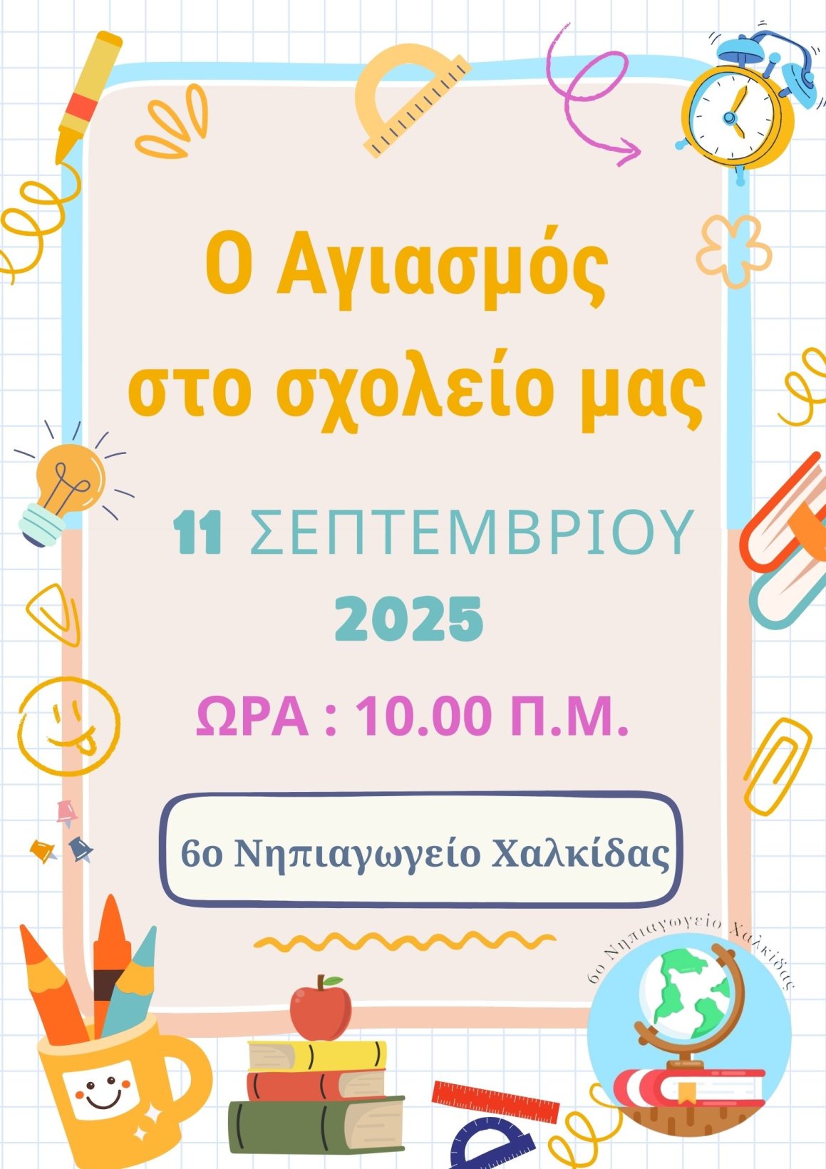 Ο Αγιασμός για την έναρξη του νέου σχολικού έτους θα γίνει την Πέμπτη 11 Σεπτεμβρίου 2025, στις 10:00 το πρωί, στο σχολείο μας. Σας περιμένουμε όλους με χαμόγελα και θετική διάθεση για μια όμορφη και δημιουργική χρονιά!