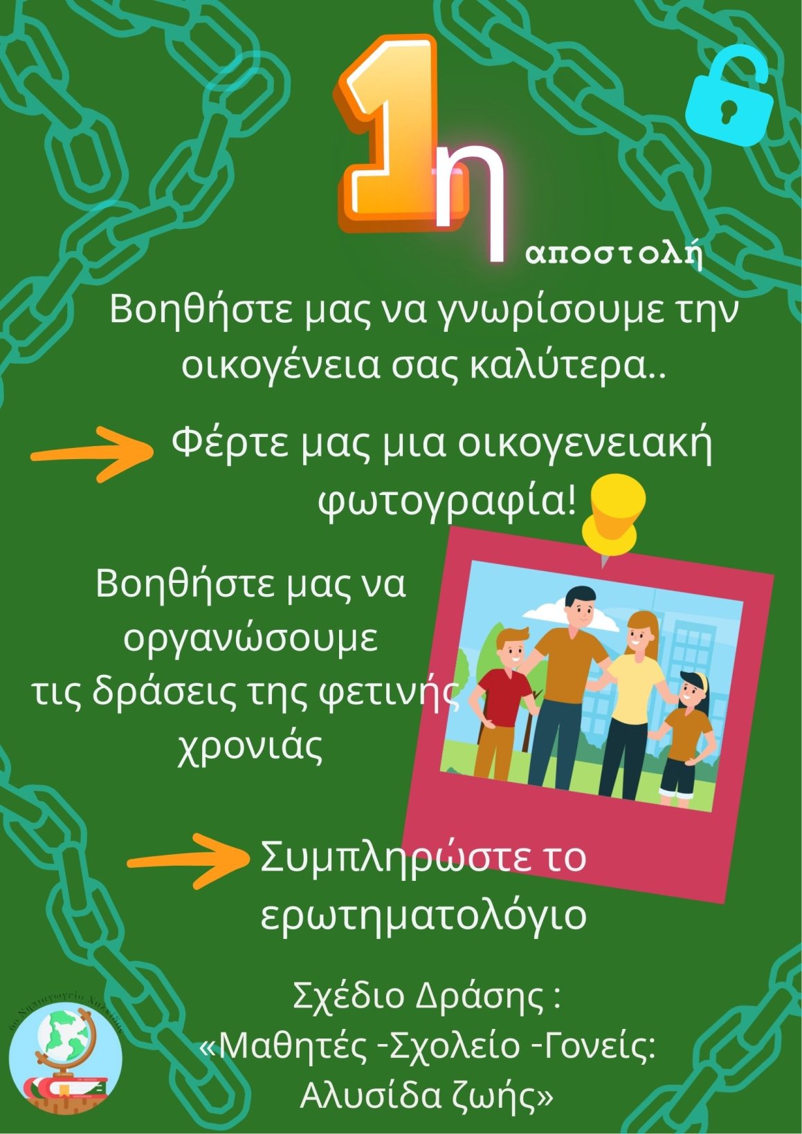 Στα πλαίσια του Σχεδίου Δράσης του σχολείου μας «Μαθητές – Σχολείο – Γονείς: Μία αλυσίδα ζωής» και με αφορμή την Παγκόσμια Ημέρα Ηλικιωμένων (1 Οκτωβρίου) την Παρασκευή 3 Οκτωβρίου 2025, οι γιαγιάδες και οι παππούδες των μαθητών μας έγιναν οι πιο ξεχωριστοί επισκέπτες μας.