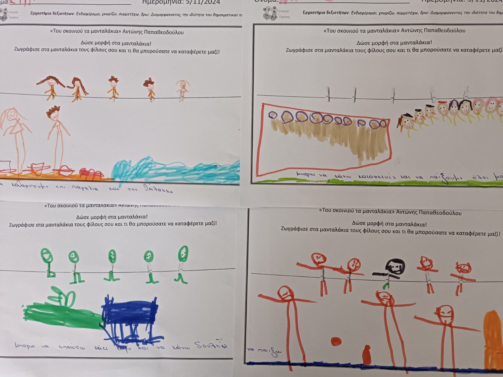 Στη συνέχεια διαβάσαμε το βιβλίου του Αντώνη Παπαθεοδούλου «Του σκοινιού τα μανταλάκια», αν τα μανταλάκια είχαν φωνή θα τα ακούγαμε να τσακώνονται, να ησυχάζουν και να σπρώχνονται, όμως όταν έρθει η ώρα να σηκώσουν την βαριά χειμωνιάτικη μπουγάδα, βοηθούν το ένα το άλλο…
