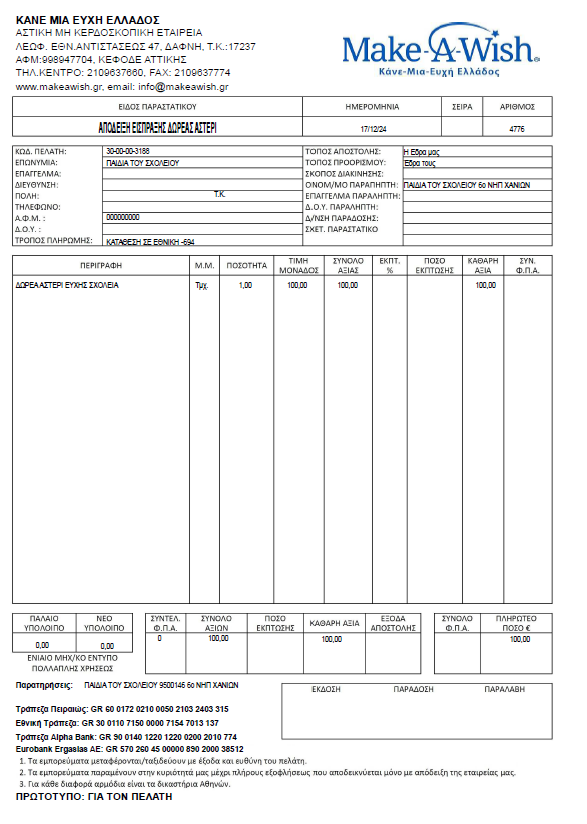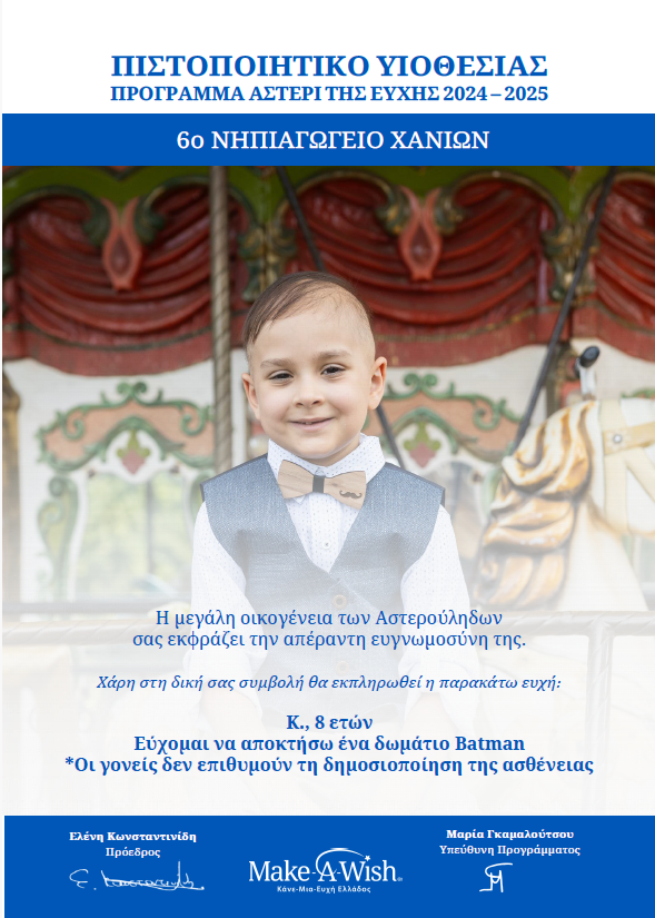 Θα θέλαμε να σας ευχαριστήσουμε για την πολύτιμη στήριξή σας στο πρόγραμμα Αστέρι της Ευχής κατά το σχολικό έτος 2024-2025. Με τη δωρεά σας συμμετέχετε και εσείς ώστε να εκπληρωθούν ευχές παιδιών που πάσχουν από σοβαρές για τη ζωή τους ασθένειες.