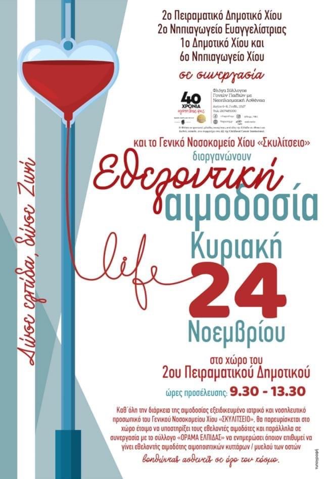 Μια μεγάλη δράση εθελοντικής αιμοδοσίας πραγματοποιήθηκε την Κυριακή 24 Νοεμβρίου 2024 στο 2οΠειραματικό Δημοτικό Σχολείο Χίου.