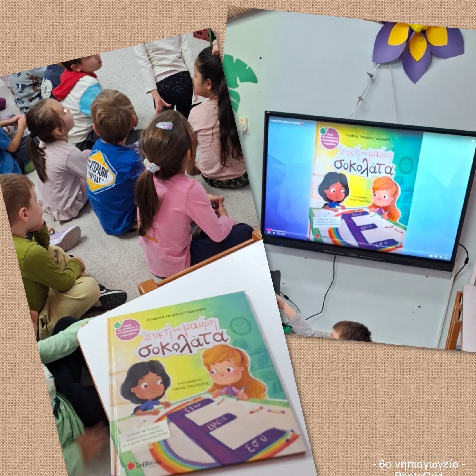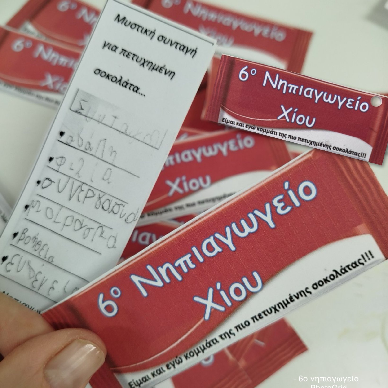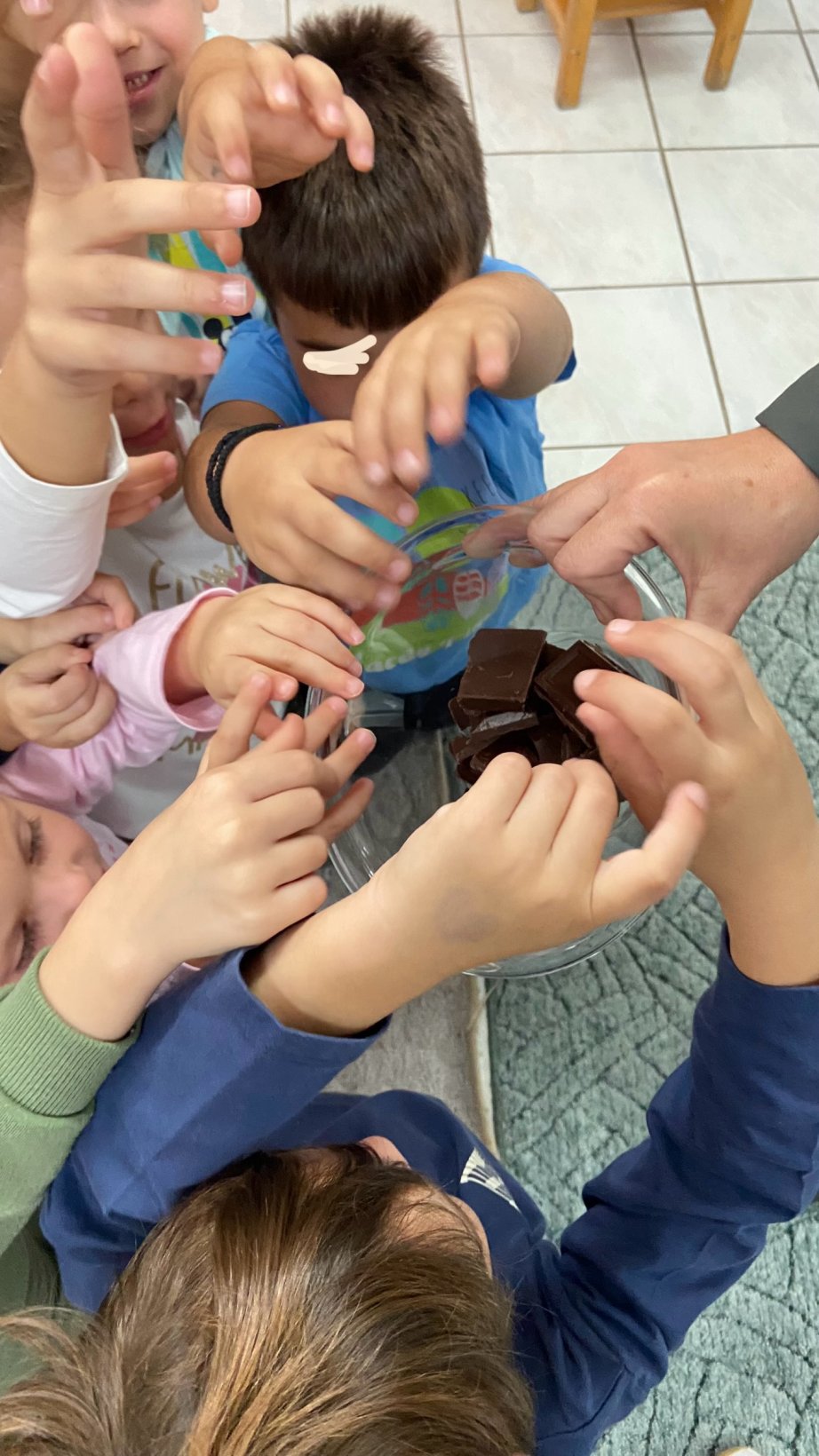 Με αφορμή την εκμάθηση του Ε από το εγώ, το εσύ, το εμείς περάσαμε σε ένα άλλο παραμύθι της Γιολάντα Τσορώνη- Γεωργιάδη την “Λευκή και μαύρη σοκολάτα”. Μιλήσαμε για την δύναμη της ομάδας ανεξάρτητα από τα ιδιαίτερα ατομικά μας χαρακτηριστικά. Φυσικά δεν θα μπορούσαμε να μην αδράξουμε την ευκαιρία να κάνουμε το πρώτο μας πείραμα γνωρίζοντας την τήξη και την πήξη αλλά και ταυτοχρόνως να δούμε ότι όποια σοκολάτα και αν γευτούμε ανεξαρτήτως χρώματος είναι η ίδια γλυκιά γεύση. Φυσικά τα δικά μας σοκολατάκια είναι μαγικά αφού έχουμε βάλει μέσα τα δικά μας μυστικά συστατικά που θα κάνουν την ομάδα μας ακόμα πιο δυνατή.