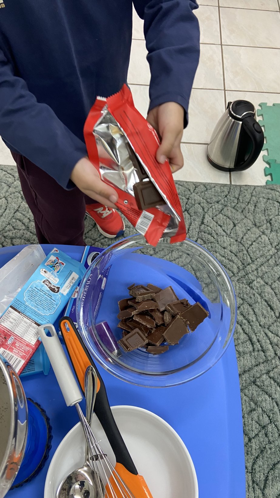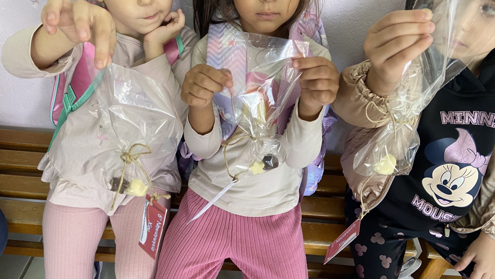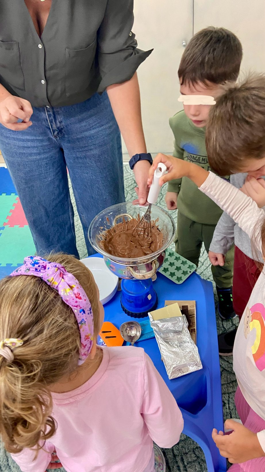 Με αφορμή την εκμάθηση του Ε από το εγώ, το εσύ, το εμείς περάσαμε σε ένα άλλο παραμύθι της Γιολάντα Τσορώνη- Γεωργιάδη την “Λευκή και μαύρη σοκολάτα”. Μιλήσαμε για την δύναμη της ομάδας ανεξάρτητα από τα ιδιαίτερα ατομικά μας χαρακτηριστικά. Φυσικά δεν θα μπορούσαμε να μην αδράξουμε την ευκαιρία να κάνουμε το πρώτο μας πείραμα γνωρίζοντας την τήξη και την πήξη αλλά και ταυτοχρόνως να δούμε ότι όποια σοκολάτα και αν γευτούμε ανεξαρτήτως χρώματος είναι η ίδια γλυκιά γεύση. Φυσικά τα δικά μας σοκολατάκια είναι μαγικά αφού έχουμε βάλει μέσα τα δικά μας μυστικά συστατικά που θα κάνουν την ομάδα μας ακόμα πιο δυνατή.