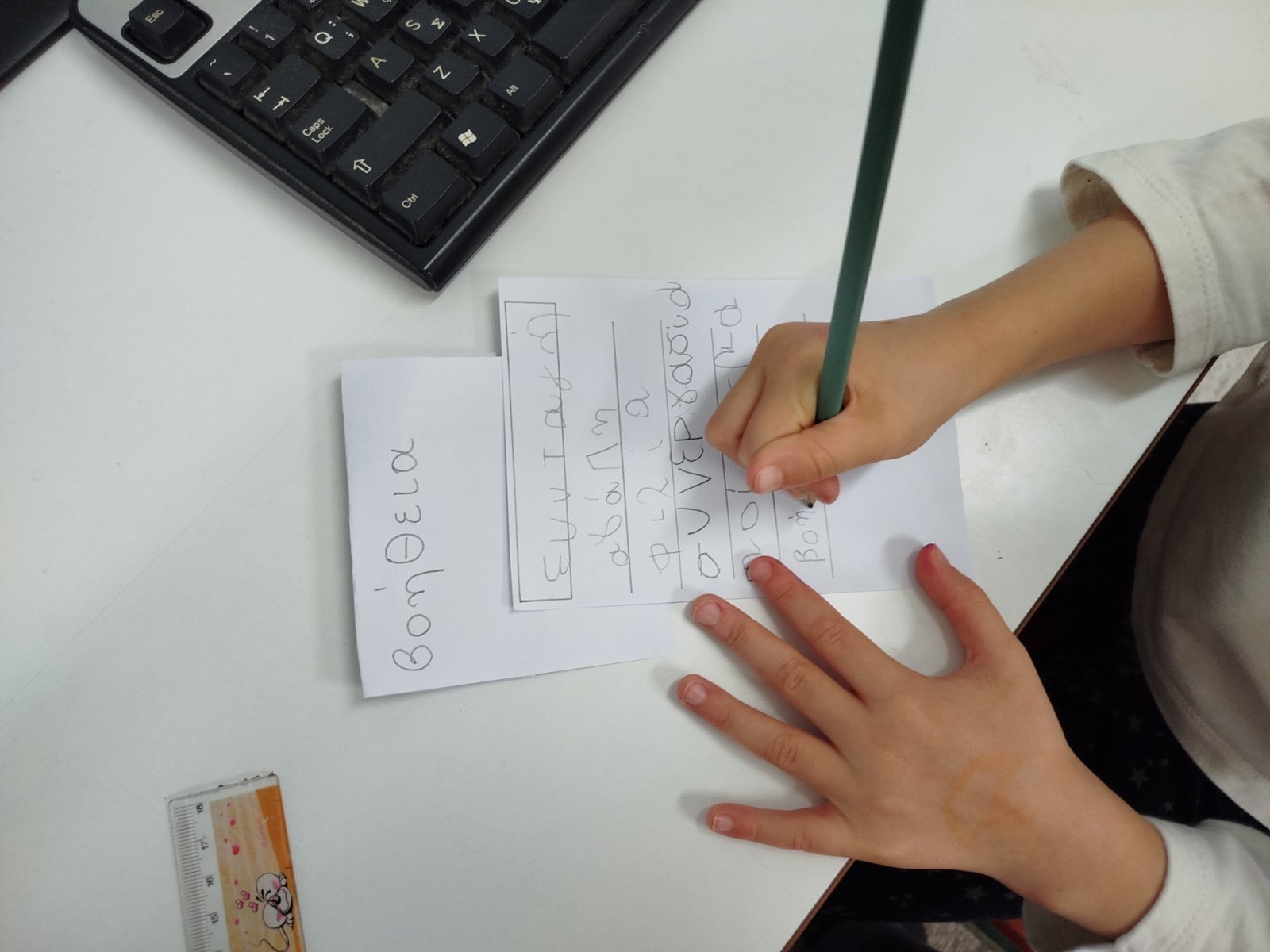 Επόμενος σταθμός το γράμμα Ε του εαυτού, του εγώ, του εσύ, του εμείς. Αφού το γνωρίσαμε, το σχηματίσαμε, το γράψαμε δημιουργήσαμε την πρώτη σελίδα του δικού μας “λεξικού” όπου τα παιδιά είπαν λέξεις που ξεκινάνε με την φωνούλα ΕΕΕΕΕΕ.
