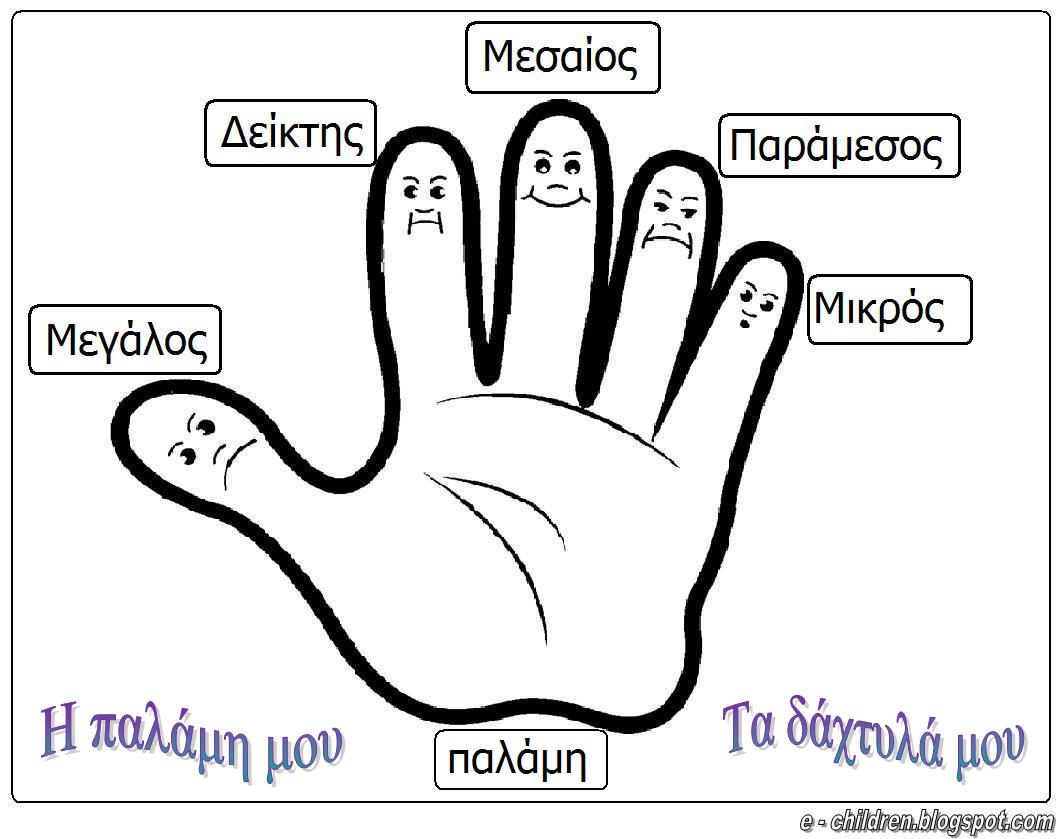 1) Μετράμε τα δάχτυλα του χεριού μας και θυμόμαστε τα ονόματά τους (αντίχειρας, δείκτης, μέσος, παράμεσος και μικρός).