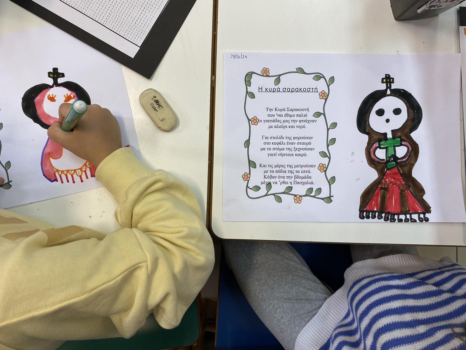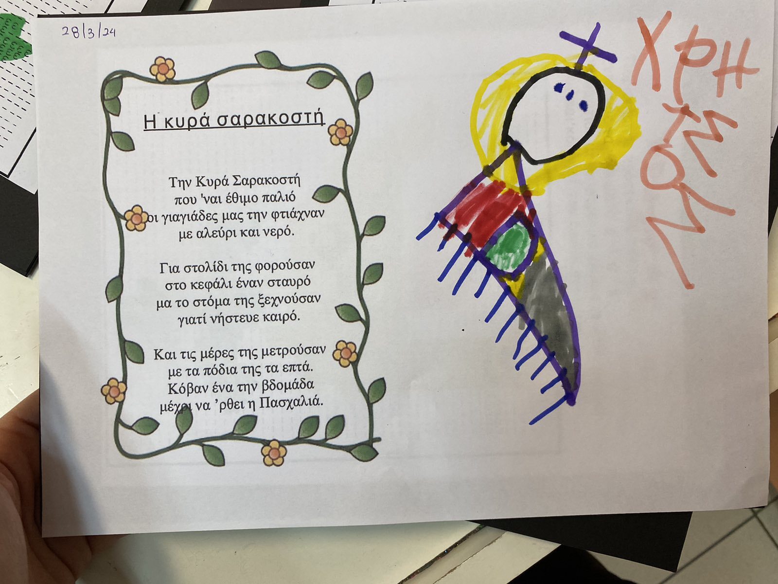 Βέβαια, οι προετοιμασίες μας και η αντίστροφη μέτρηση για το Πάσχα ξεκίνησαν τη Σαρακοστή. Μετά την Καθαρά Δευτέρα μιλήσαμε για την περίοδο που ονομάζουμε Σαρακοστή, καθώς και την κυρία Σαρακοστή, την οποία φτιάξαμε (ατομικά και ομαδικά) ώστε να μετράμε πόσες εβδομάδες απομένουν για το Πάσχα.