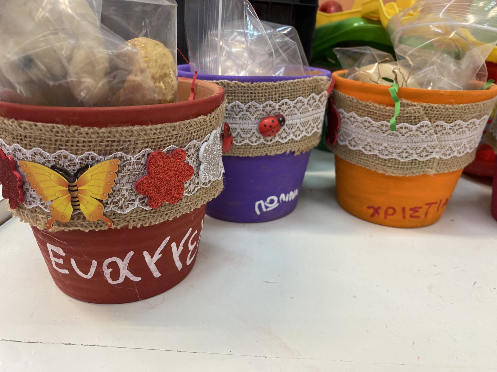 Μετά τον στολισμό των κασπώ , τα γεμίσαμε με τα γλυκά που είχαν φτιάξει τα παιδιά στο σχολείο, τοποθετήθηκαν τα βρασμένα-βαμμένα αυγά που φτιάξαμε στο σχολείο και τοποθετήθηκαν βολβοί φρέζας, ώστε να μπορέσουν τα κασπώ να γίνουν όμορφες γλάστρες.