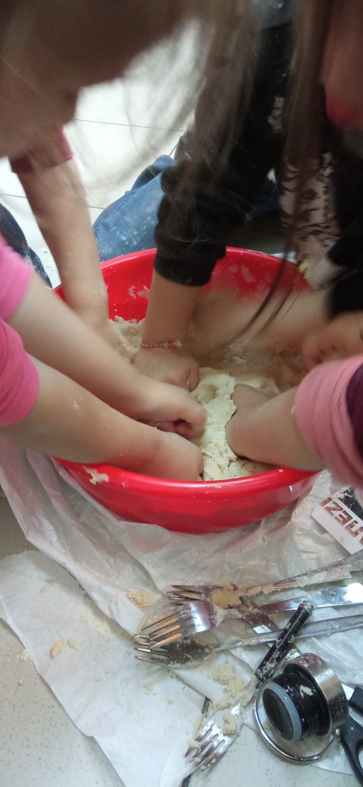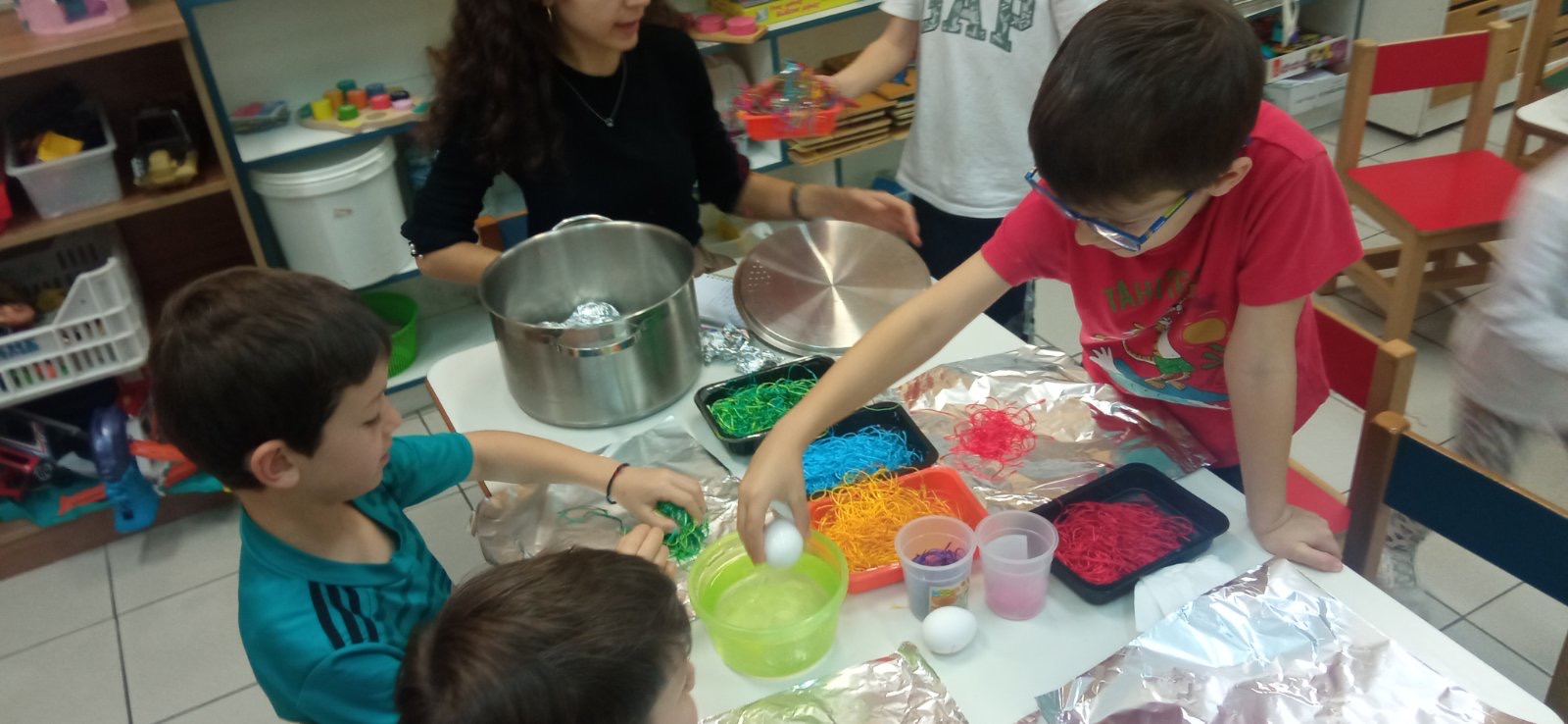 Τα παιδιά ξεχώρισαν τις κλωστές ανά χρώμα. Στη συνέχεια, τοποθέτησαν μέσα σε ένα κομμάτι αλουμινόχαρτο τα χρώματα της επιλογής τους και έβαλαν ένα αυγό. Οι εκπαιδευτικοί τύλιξαν το αλουμινόχαρτο σαν καραμέλα, έγιναν τρύπες και μπήκαν στην κατσαρόλα για να βράσουν.