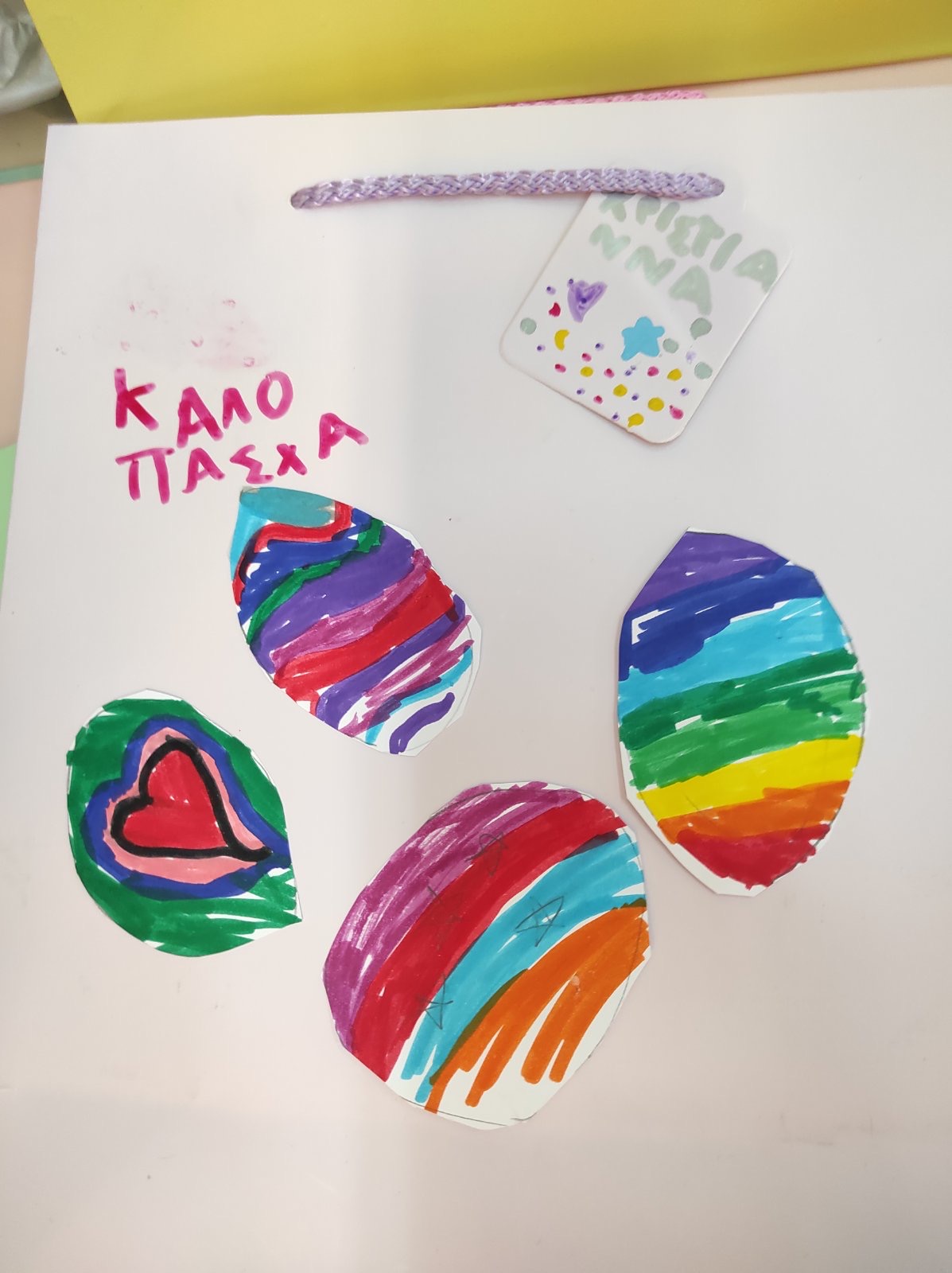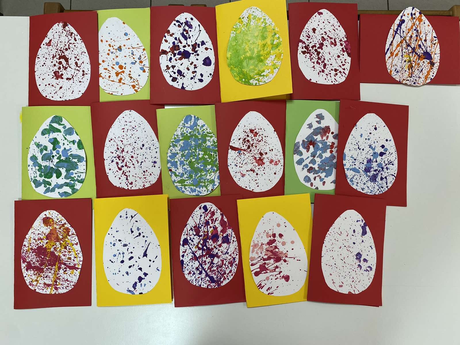 Τα παιδιά έκοψαν τα αυγά διαφορετικών σχεδίων και χρωμάτων, τα στόλισαν χρησιμοποιώντας λαδοπαστελ και