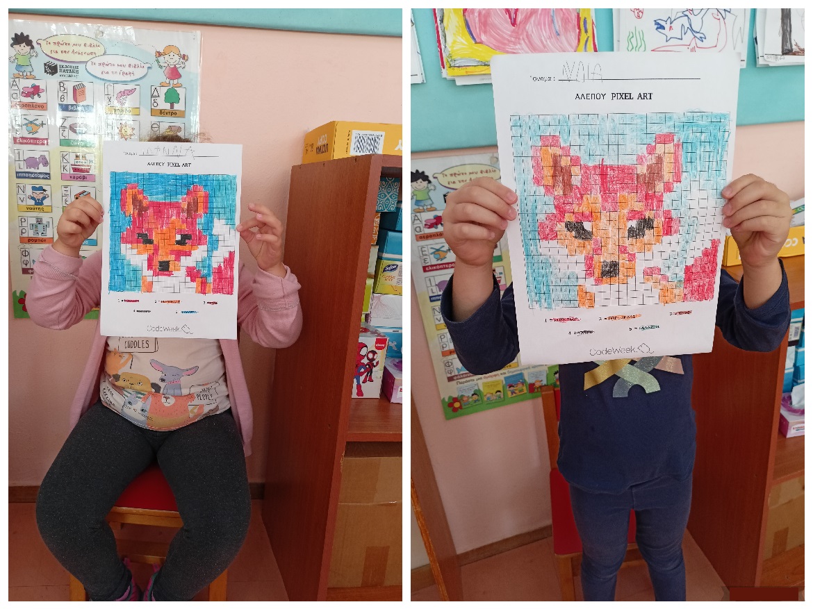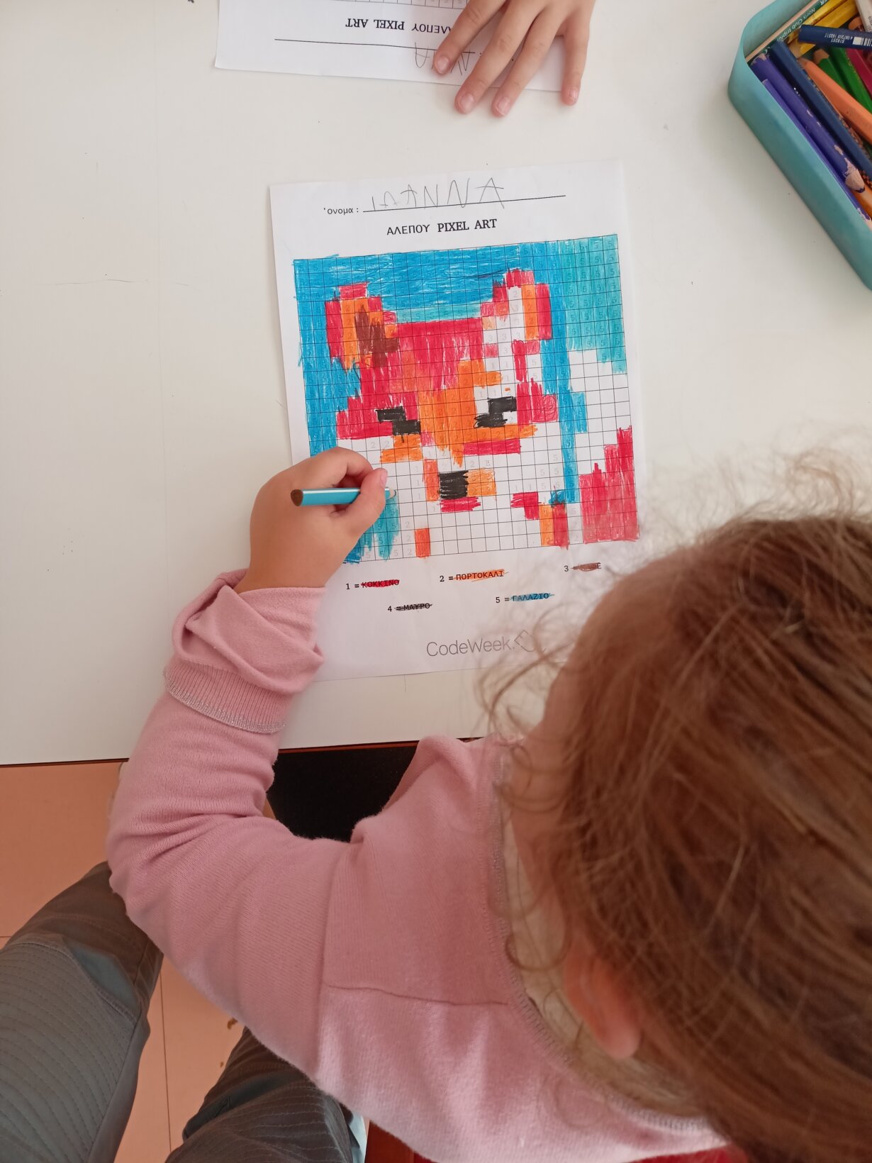 Συνδέοντας το θέμα των Εργαστηρίων Δραστηριοτήτων: “Μια Αγκαλιά για τα Ζώα”, με την Ευρωπαϊκή Εβδομάδα Προγραμματισμού τα παιδιά ζωγραφίζουν σε φύλλα εργασίας τα κουτάκια (pixels) σύμφωνα με τον αριθμητικό/χρωματικό κώδικα που τους δόθηκε (κάθε αριθμός αντιστοιχεί σε ένα χρώμα)έτσι ώστε να εμφανιστεί η μυστική εικόνα (ένα ζώο).