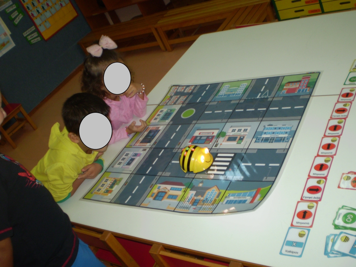 Χρησιμοποιείται επιδαπέδια απεικόνιση πόλης χωρισμένη σε τετράγωνα 15Χ15 με δρόμους και κτίρια. Ζητήθηκε από τα παιδιά να προγραμματίσουν το επιδαπέδιο ρομποτικό σύστημα BEE BOT ώστε να οδηγείται στα διάφορα κτίρια.