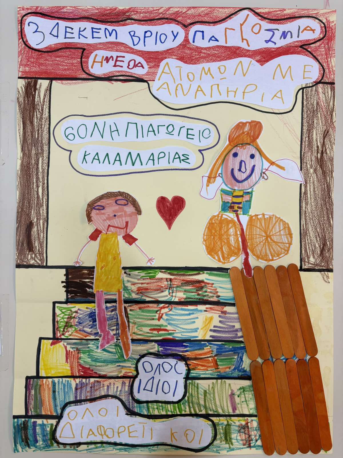 Ο Δεκέμβριος στο νηπιαγωγείο συνδυάζει τη μαγεία των Χριστουγέννων με σημαντικές δράσεις ευαισθητοποίησης για την Παγκόσμια Ημέρα Ατόμων με Αναπηρία (3 Δεκεμβρίου) που καθιερώθηκε το 1992 με απόφαση της γενικής συνέλευσης του ΟΗΕ. Αυτή η περίοδος προσφέρει πλούσιο έδαφος για καλλιέργεια αξιών όπως η αγάπη, ο σεβασμός, η ενσυναίσθηση, η αποδοχή της διαφορετικότητας και της μαθητικής ετερογένειας. Δραστηριότητες εγιναν σήμερα 3 Δεκεμβρίου, με αφορμή την Παγκόσμια Ημέρα Ατόμων με Αναπηρία, σύμφωνα με σχετική εγκύκλιο της υπουργού Παιδείας. Στο 6ο ΝηπιαγωγειοΚαλαμαριάς επιλέξαμε♥Βιωματικά Παιχνίδια όπως να περπατήσουν με δεμένα μάτια (με τη βοήθεια οδηγού/συμμαθητή) ή να προσπαθήσουν να επικοινωνήσουν μόνο με νοηματική ή παντομίμα,♥παιδικά βιβλία που αφορούν τη διαφορετικότητα και την αναπηρία, όπως “Η Αργυρώ γελάει”, και συζητήσαμε για τους ήρωες και τα συναισθήματά τους,♥ εκπαιδευτικά βίντεο στο διαδίκτυο που εξηγούν με απλό και κατανοητό τρόπο την έννοια της αναπηρίας, κατάλληλα για την προσχολική ηλικία ,♥ δημιουργησαμε Ομαδική αφίσα για να δωσουμε το δικο μας μηνυμα το 1ο τμημα και το 2ο τμημα ομαδικο εργο για ένα σχολείο προσβάσιμο όπου ο καθένας μπορεί να κινηθεί χωρίς φόβο και χωρίς εμπόδια στα πλαίσια του τί αλλαγές θα κάνατε στο σχολείο σας για το λόγο αυτό ♥Παραλληλα συμμείχαμε εξ αποστάσεως, με το υλικο που αποστείλαμε συμβάλοντας στην εκδήλωση που διοργανωθηκε με αφορμή την Παγκόσμια Ημέρα Ατόμων με Αναπηρία, στις 3 Δεκεμβρίου 2025 στο υπουργείο Παιδείας, Θρησκευμάτων και Αθλητισμού.