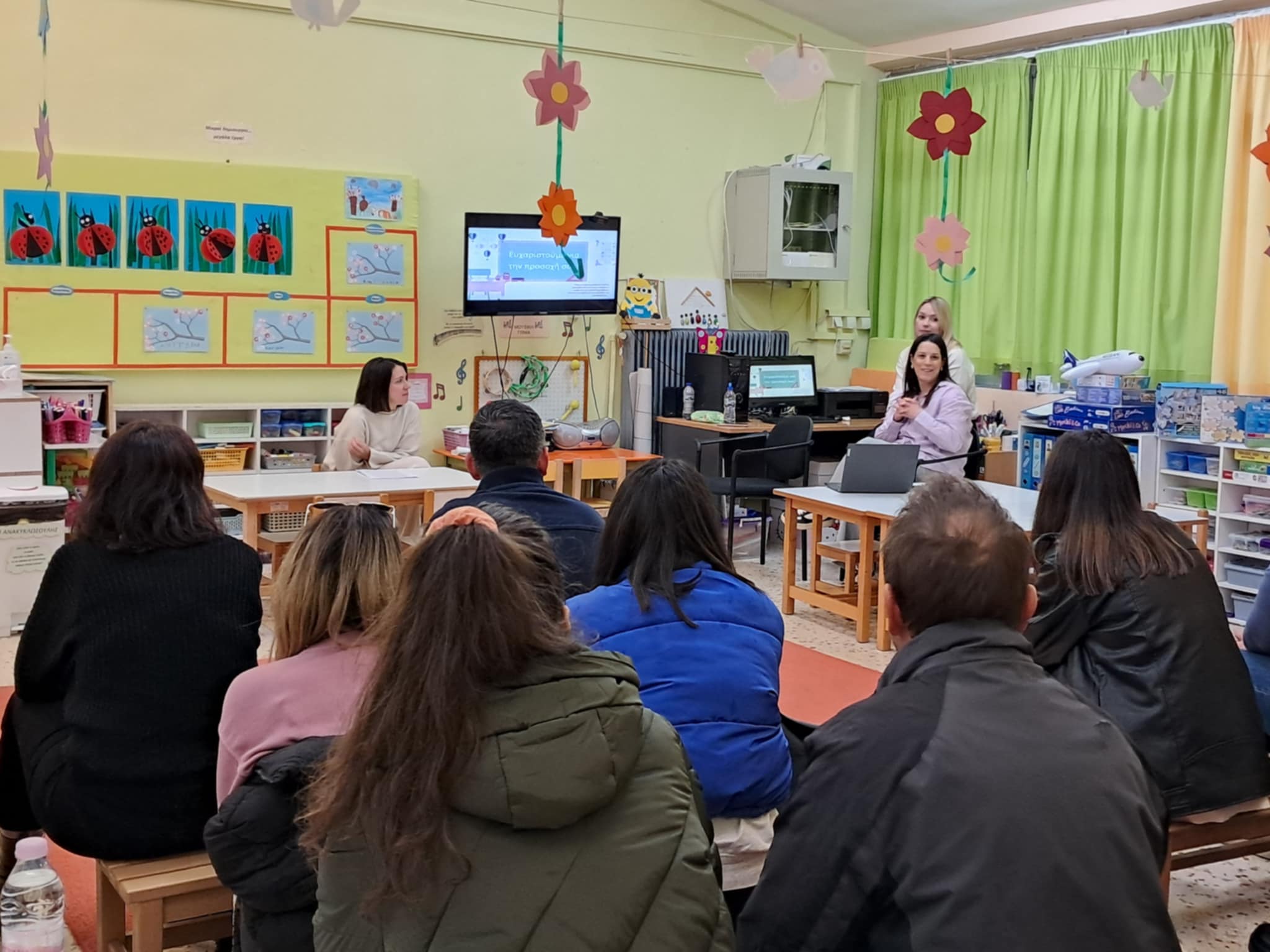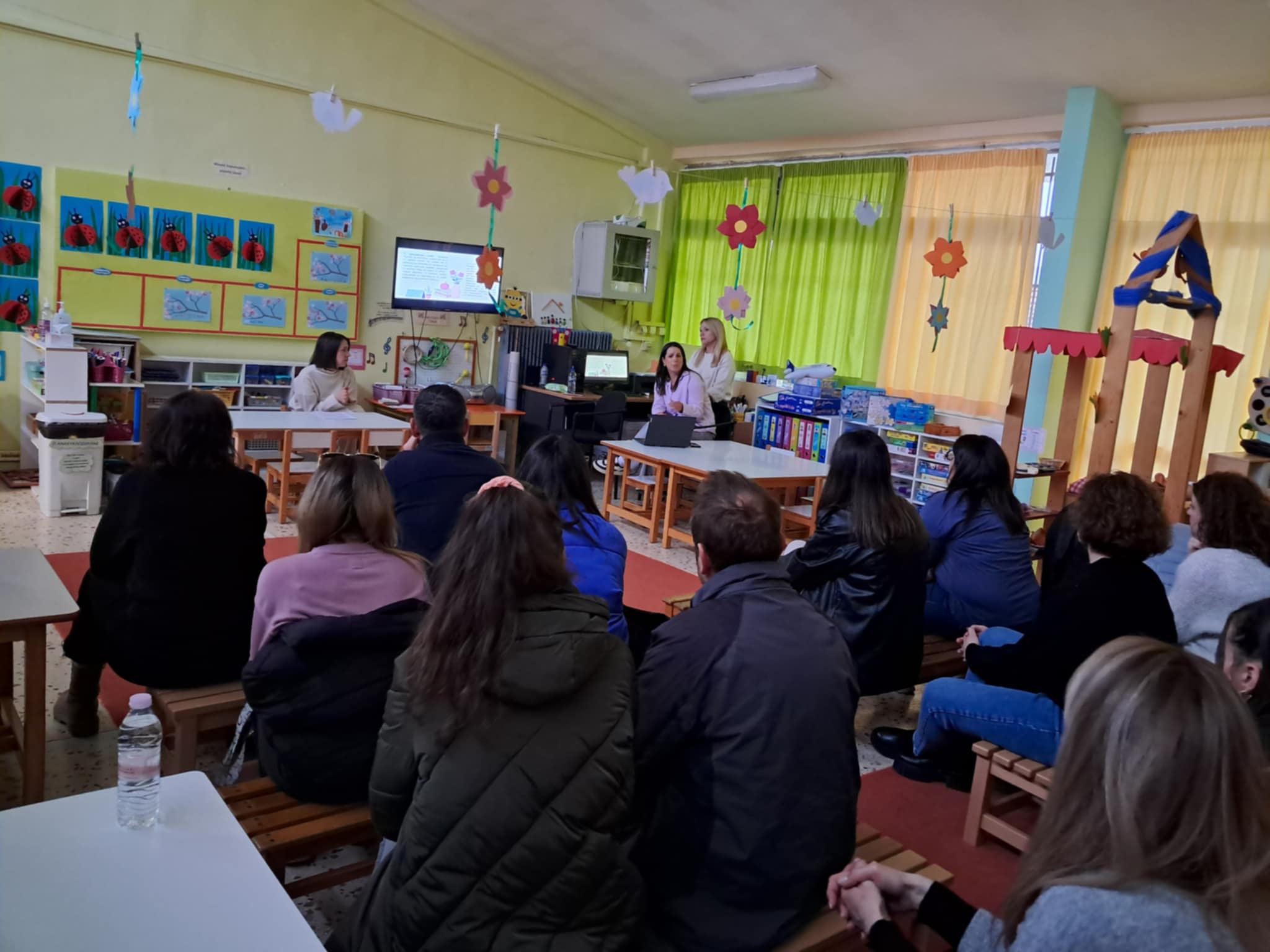 Οι ομιλήτριες Αγαθοπούλου Ευγενία ΠΕ21, Αθανασοπούλου Ελευθερία ΠΕ30 και Παπαδοπούλου Ελένη ΠΕ60.ΕΑΕ, παρουσίασαν με εξαιρετικό τρόπο τα στάδια ανάπτυξης των νηπίων (γλωσσική , γνωστική, ψυχοκινητική, κοινωνικοσυναισθηματική ανάπτυξη) και αναφέρθηκαν τα ορόσημα και τυχόν δυσκολίες στους παραπάνω τομείς, που μπορεί να απαιτούν πρώιμη παρέμβαση. Τόνισαν ιδιαίτερα τη σημασία της συνεργασία οικογένειας και σχολείου και έλυσαν σημαντικές απορίες των γονέων των μαθητών/ τριών μας.