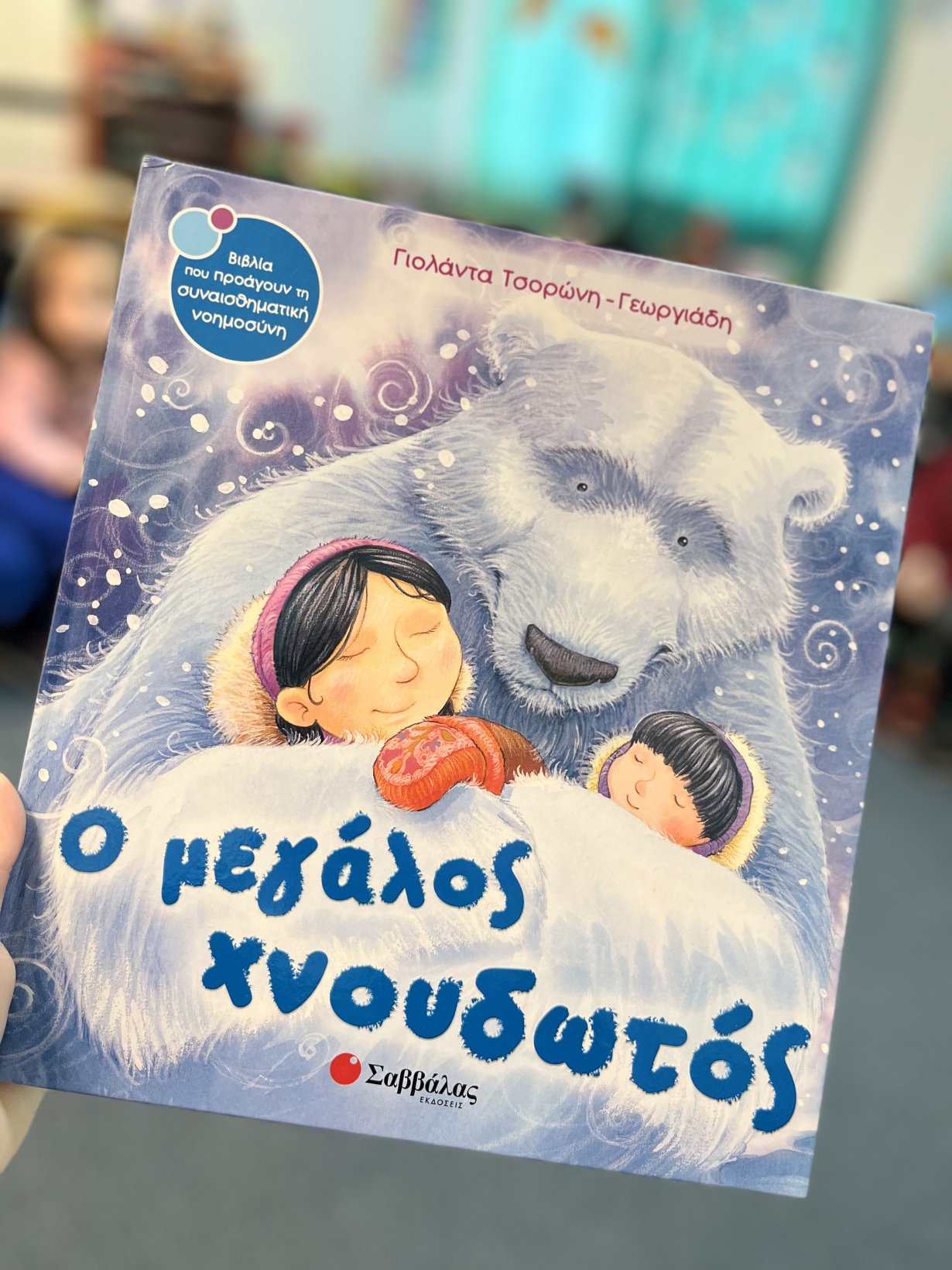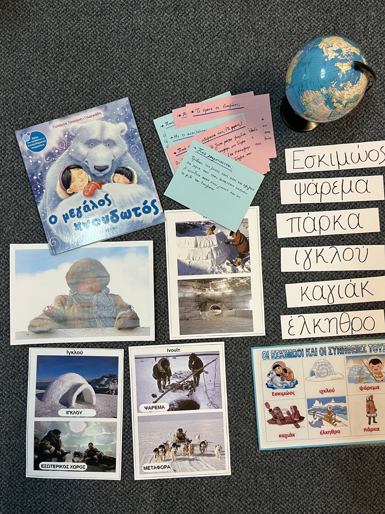 Στη συνέχεια, είδαμε εικόνες που αφορούν τους Εσκιμώους και τις συνήθειές τους, μάθαμε σημαντικές πληροφορίες για τη ζωή τους και φυσικά διαβάσαμε το παιδικό βιβλίο με τίτλο: Ο μεγάλος χνουδωτός, στο οποίο πρωταγωνιστές είναι δύο αδέρφια Εσκιμώοι και μία πολική αρκούδα!