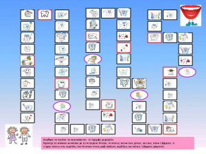 Επιτραπέζιο παιχνίδι: Βοήθησε τα παιδιά να κατακτήσουν το όμορφο χαμόγελο. Πρόσεξε τα κόκκινα κουτάκια με τα πονεμένα δόντια αν πέσεις πάνω τους χάνεις και πηγαίνεις πίσω τρία κουτάκια. Άν όμως πέσεις στους μοβ κύκλους με τη νεράιδα των δοντιών κερδίζεις και κάνεις τρία βήματα μπροστά.
