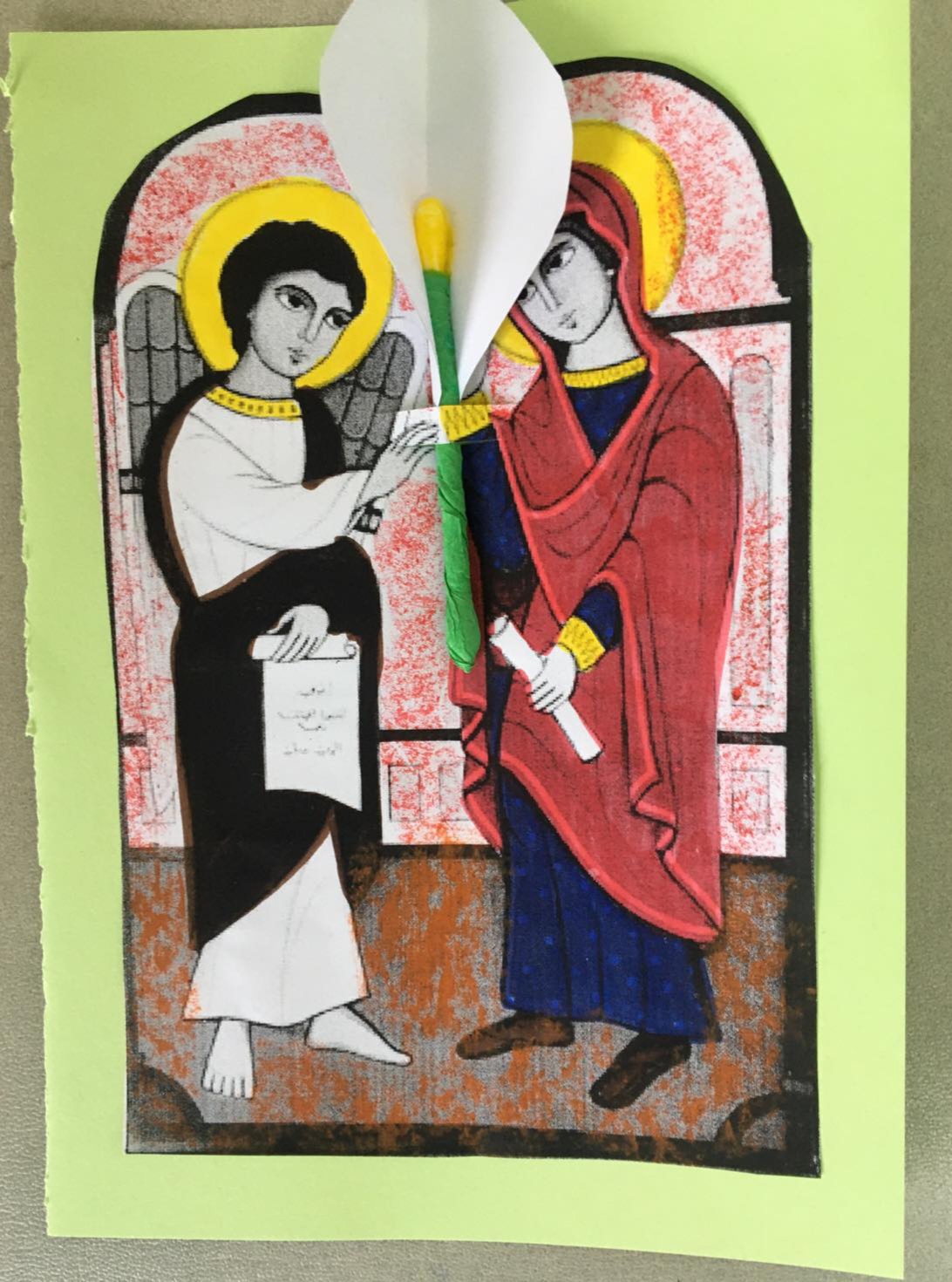 Τα παιδιά ζωγράφισαν μια παράσταση που απεικόνιζε τον Ευαγγελισμό της Θεοτόκου. Ο αρχάγγελος Γαβριήλ προσφέρει τον κρίνο στην Παρθένο Μαρία και της μεταφέρει την χαρμόσυνη είδηση ότι πρόκειται να γεννήσει τον Χριστό, τον υιό του Θεού.