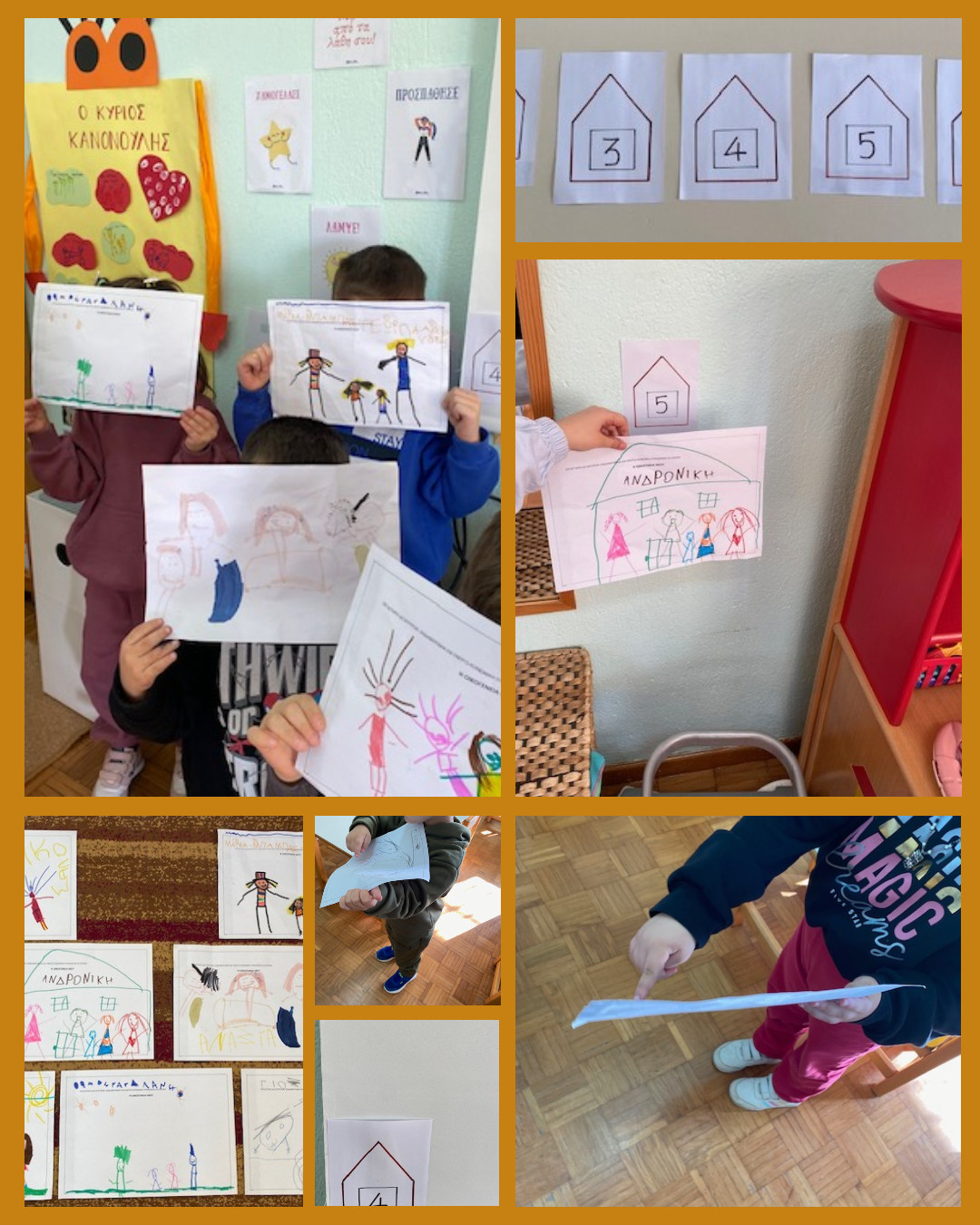 Είχαμε αναρτήσει σε διάφορα σημεία της τάξης καρτελάκια με αριθμούς που αφορούσαν στο πλήθος των μελών μιας οικογένειας (πχ. καρτελάκια με αριθμούς από το 2 έως το 10). Κάθε μαθητής με τη ζωγραφιά της οικογένειάς του στα χέρια, ανάλογα με το πλήθος των μελών που εικονίζονταν σε αυτήν, κατευθυνόταν στον χώρο με το αντίστοιχο καρτελάκι.