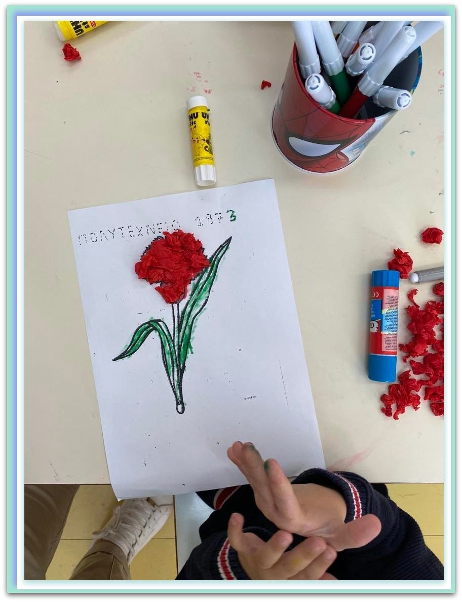 Τέλος γίναμε ζωγράφοι και δημιουργήσαμε έναν πίνακα για το Πολυτεχνείο τον οποίο αξιοποιήσαμε στην γιορτή μας .Όλοι καταθέσαμε ένα κόκκινο γαρύφαλλο για να τιμήσουμε και εμείς τους φοιτητές που αγωνίστηκαν για τη Δημοκρατία.