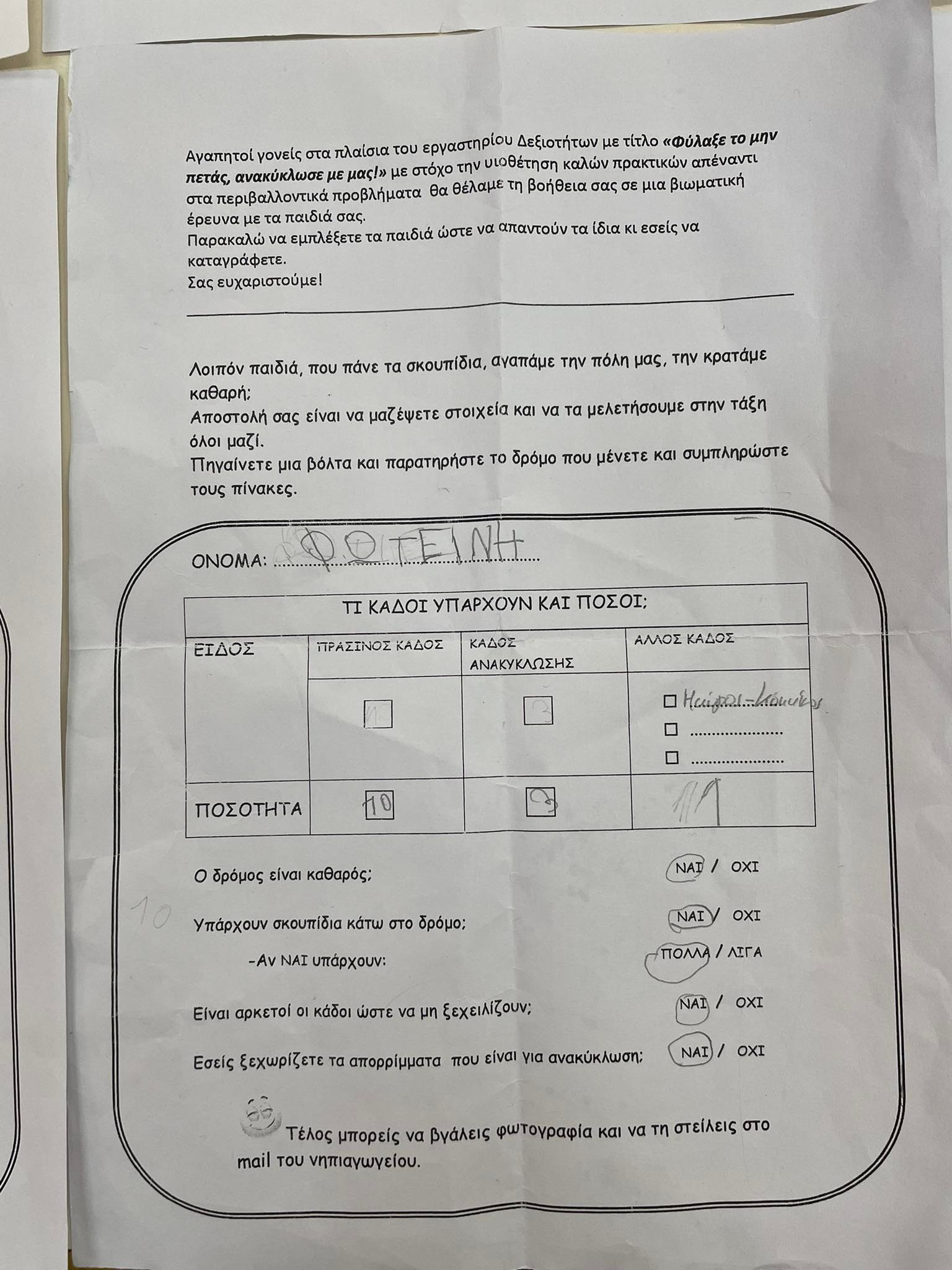 “Λοιπόν παιδιά, πού πάνε τα σκουπίδια, αγαπάμε την πόλη μας,την κρατάμε καθαρή……..;;;;;;