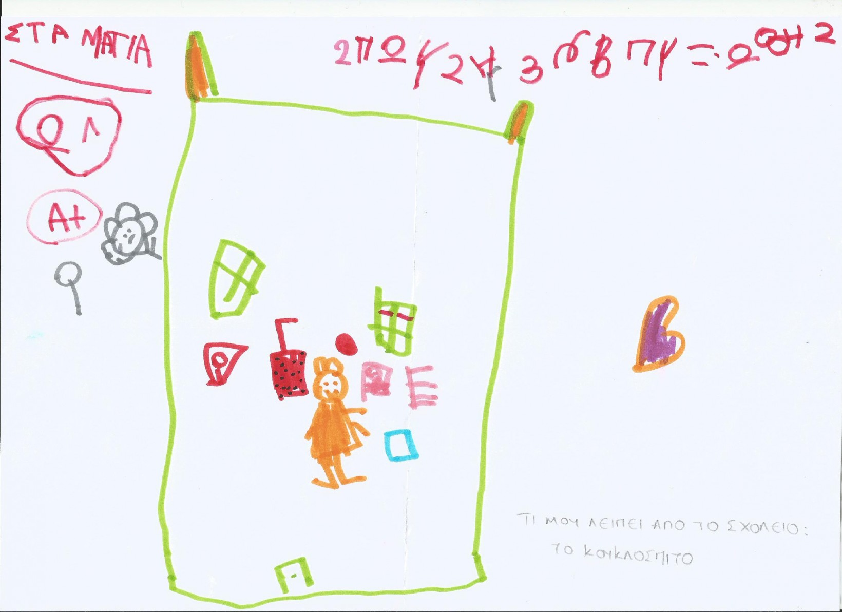 Με την έναρξη της τηλεκπαίδευσης στις 18 Νοεμβρίου 2020, στην πρώτη μας δηλαδή συνάντηση στην πλατφόρμα Webex, ζητήσαμε από τα παιδιά να ζωγραφίσουν σε ένα χαρτί «τι τους λείπει από το νηπιαγωγείο, τώρα που είναι κλειστό» και να μας παρουσιάσουν τη ζωγραφιά τους στο επόμενο μάθημα. Από τις ζωγραφιές και τον σχολιασμό τους, προκύπτει ότι τους λείπει πάρα πολύ το σχολείο.