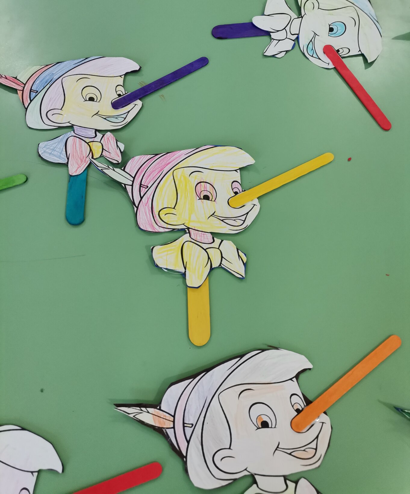 Με αφορμή την ιστορία αυτή, κατασκευάσαμε κούκλες Πινόκιο που στη συνέχεια τις “ζωντανέψαμε” στο κουκλοθεάτρό μας λέγοντας αστεία ψεματάκια!!!