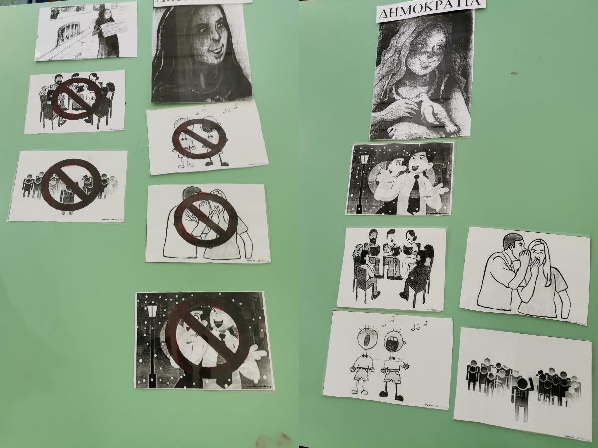 Με τη χρήση κατάλληλου εποπτικού υλικού συζητήσαμε σχετικά με τις συνθήκες που επικρατούν σε καιρούς Δημοκρατίας και Δικτατορίας αντίστοιχα.