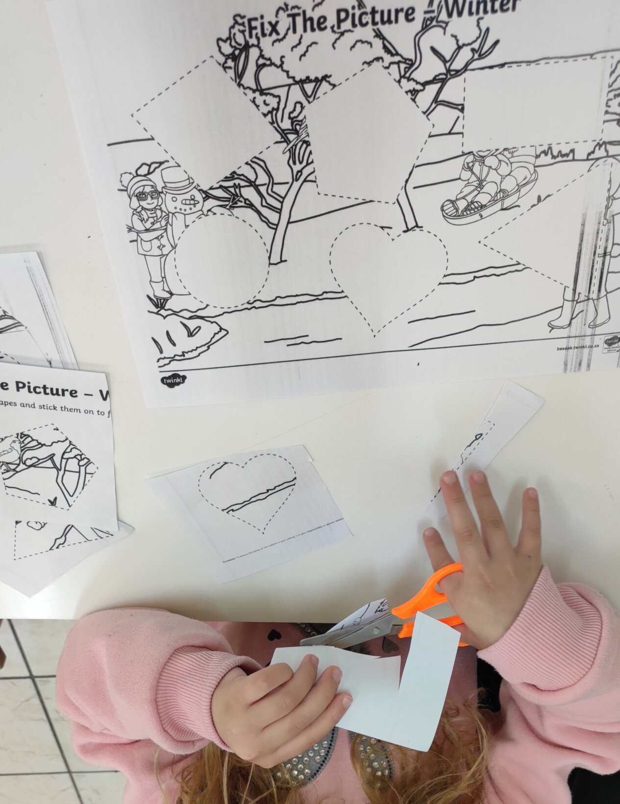 Μία δεύτερη δραστηριότητα που κέρδισε το ενδιαφέρον των παιδιών είναι η κοπή και τοποθέτηση σχημάτων πάνω σε προτυπωμένες εικόνες. Τα παιδιά χρησιμοποίησαν ψαλίδια για να κόψουν σχήματα (όπως καρδιές, κύκλους, ρόμβους) και στη συνέχεια τα κόλλησαν στις σωστές θέσεις, ολοκληρώνοντας μια χειμωνιάτικη εικόνα. Αυτή η διαδικασία τα βοηθά να εξασκηθούν στη χρήση του ψαλιδιού και να κατανοήσουν πώς κάθε σχήμα μπορεί να ενσωματωθεί σε ένα μεγαλύτερο σύνολο.