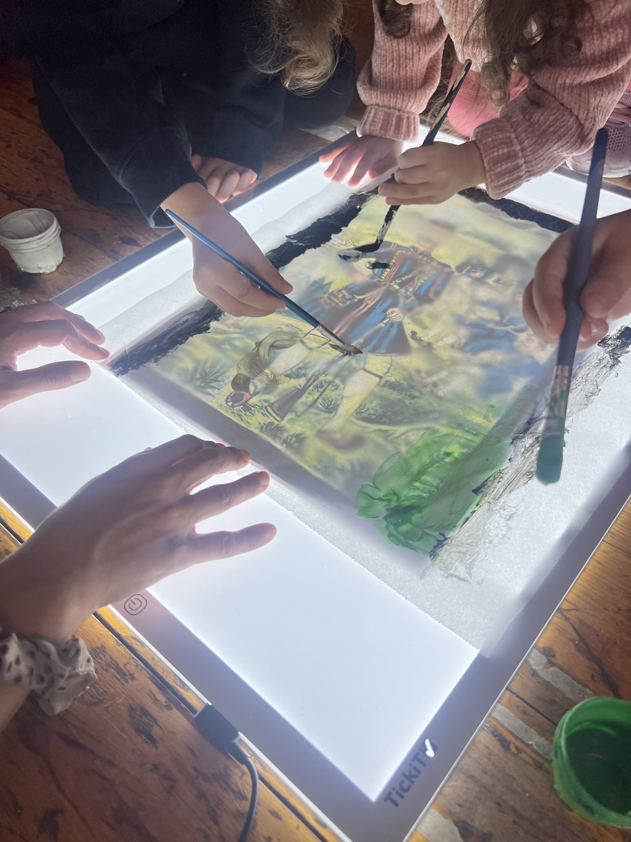 Το ταξίδι μας ολοκληρώθηκε με μία μικρή «επίσκεψη» στην τέχνη: παρατηρήσαμε πίνακες του Καντίνσκι, αναγνωρίσαμε σχήματα μέσα στα έργα του και συζητήσαμε πώς εκείνος κατάφερε να τα μετατρέψει σε μαγικές, πολύχρωμες εικόνες.