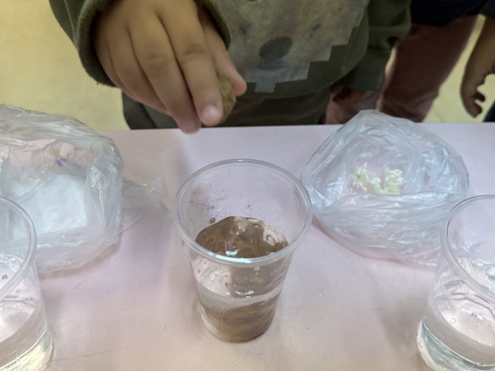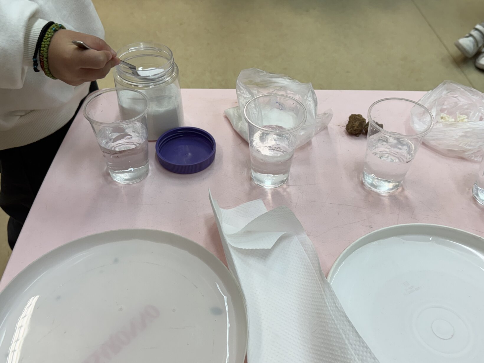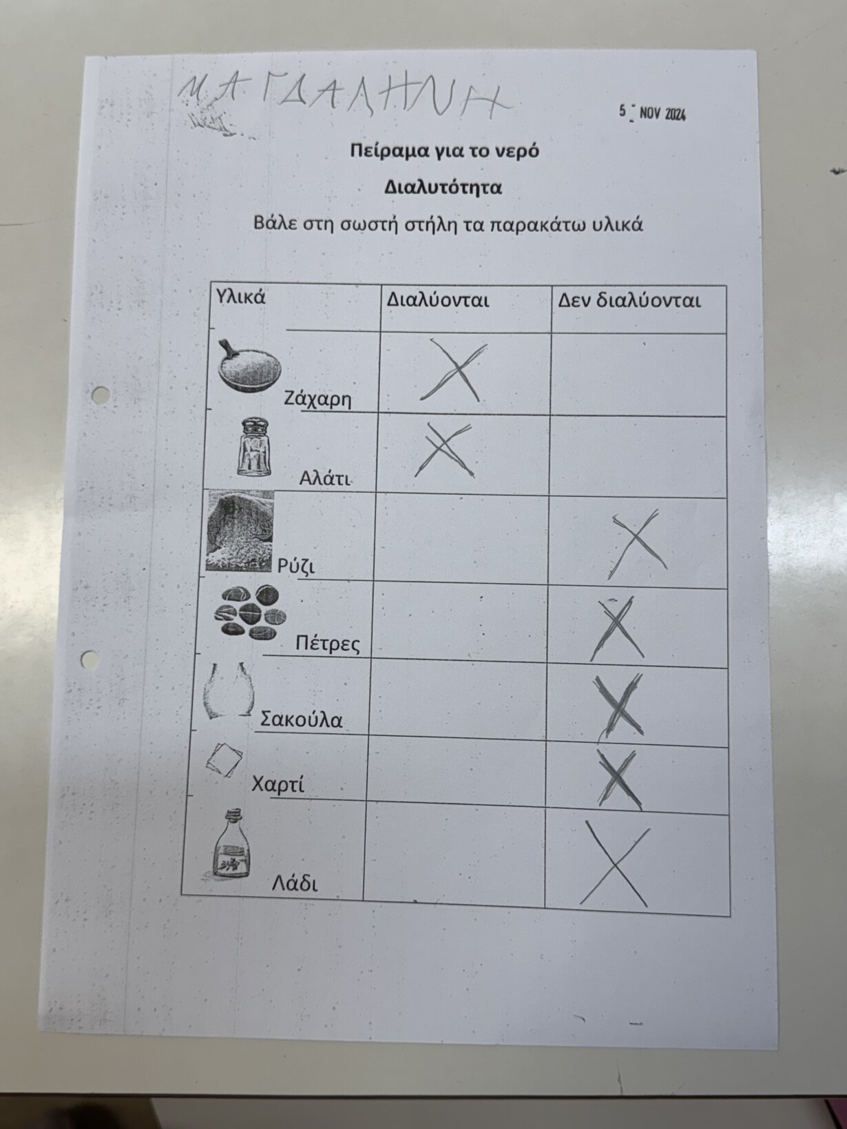 Πειραματιστήκαμε με διάφορα υλικά… Πρώτα κάναμε υποθέσεις και μετά διαπιστώσαμε ποια από αυτά τα υλικά διαλύονται στο νερό και ποια όχι…