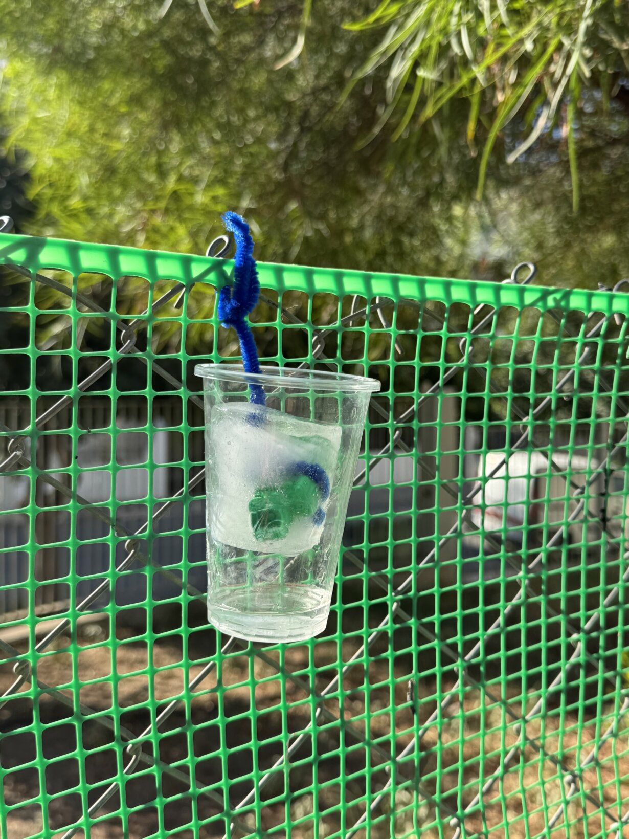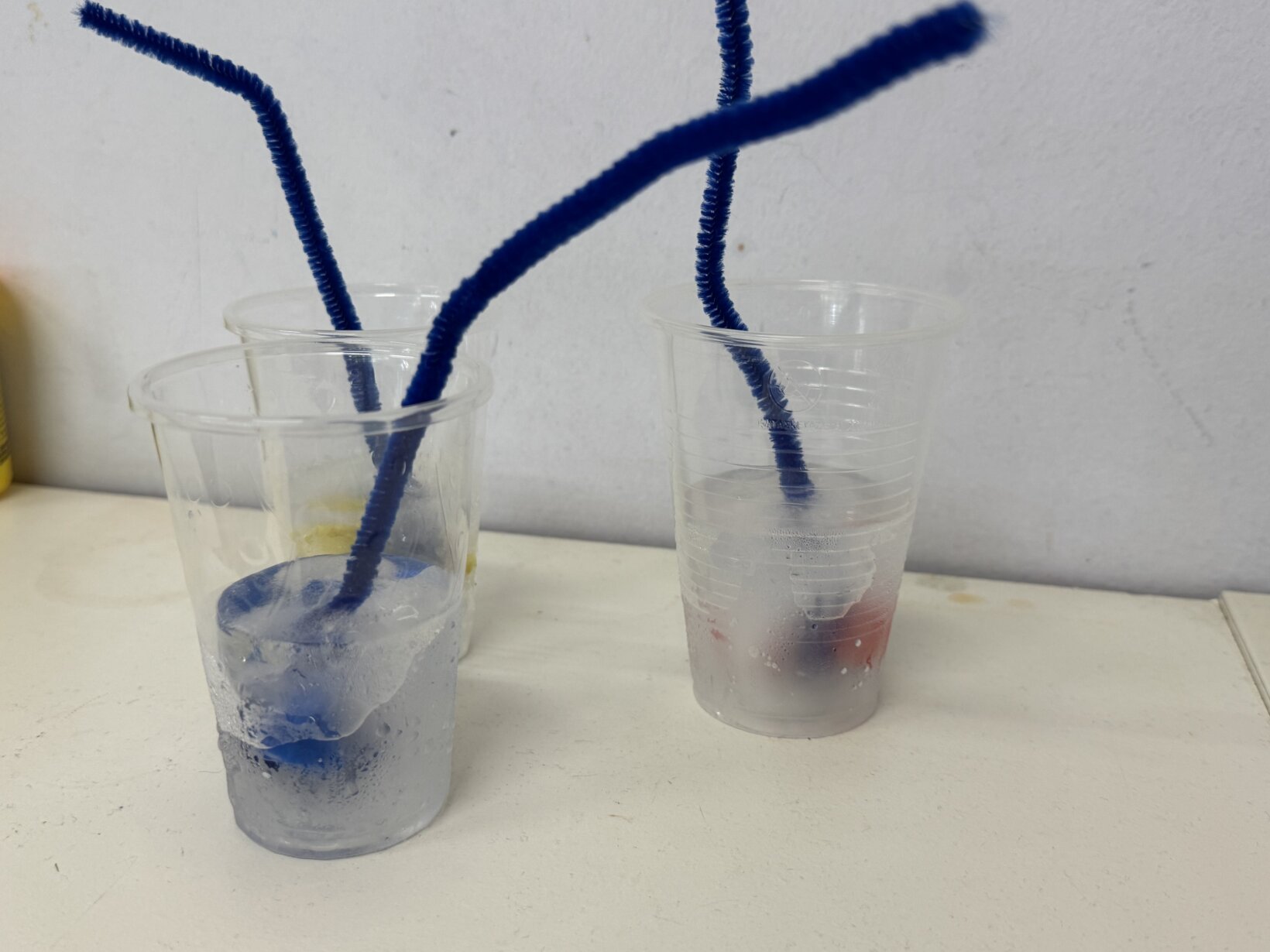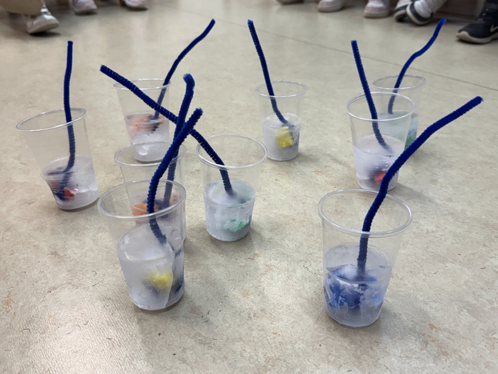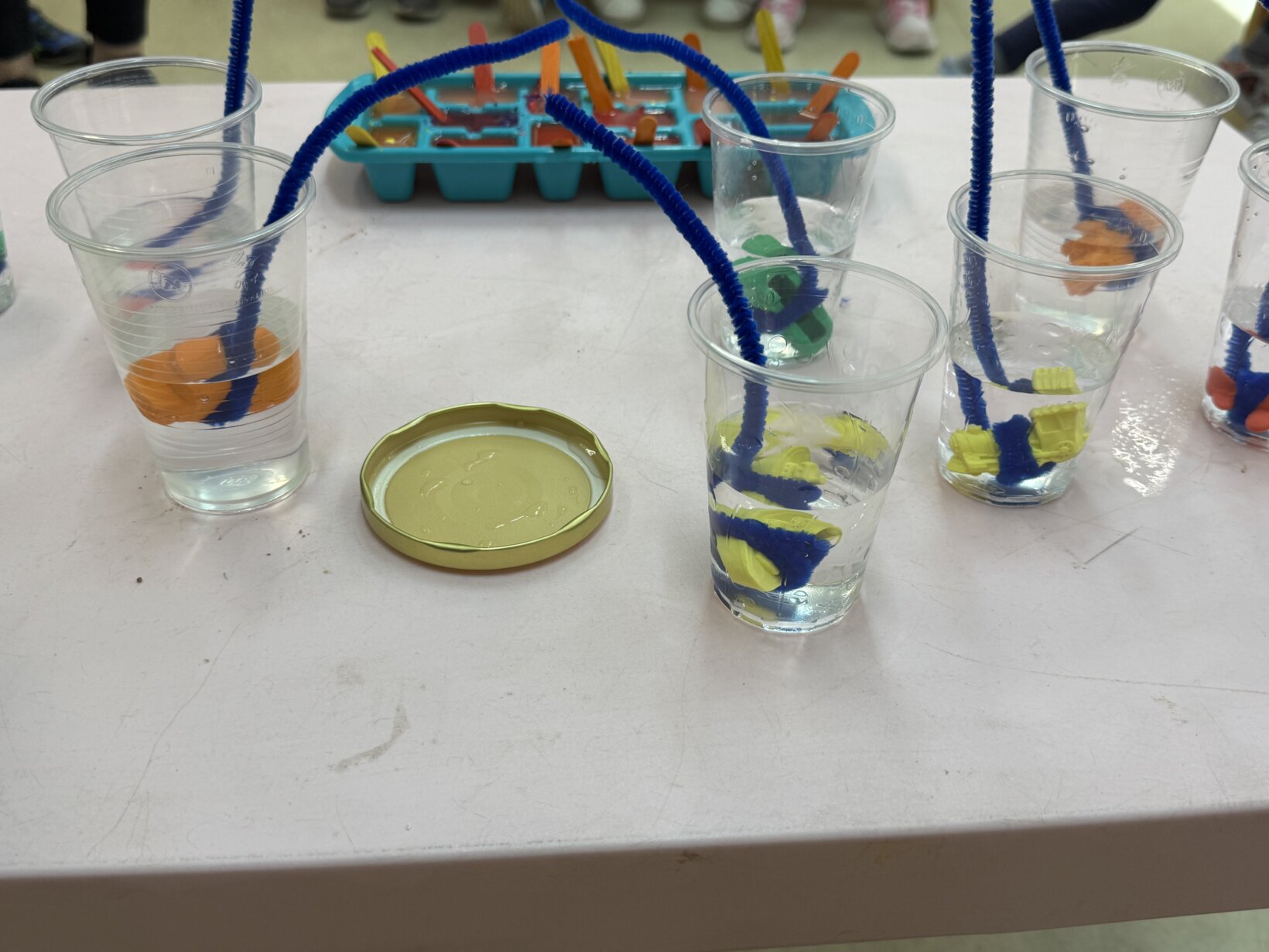 Μιλώντας για τις διάφορες μορφές που μπορεί να πάρει το νερό, βάλαμε νερό σε μικρά διάφανα ποτήρια κι εκεί μέσα βάλαμε και μικρά παιχνίδια της τάξης μας. Βάλαμε τα ποτήρια στην κατάψυξη και περιμέναμε την επόμενη ημέρα για να δούμε τι θα γίνει…
