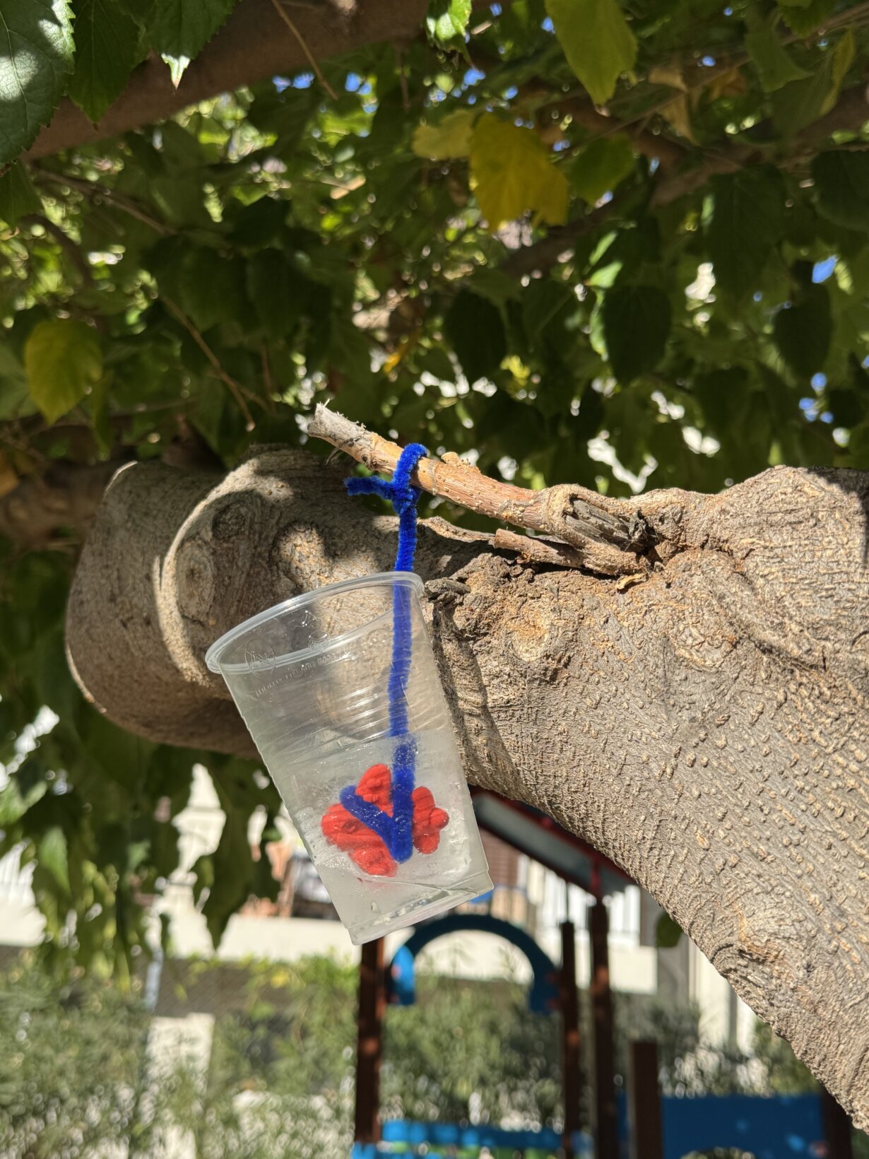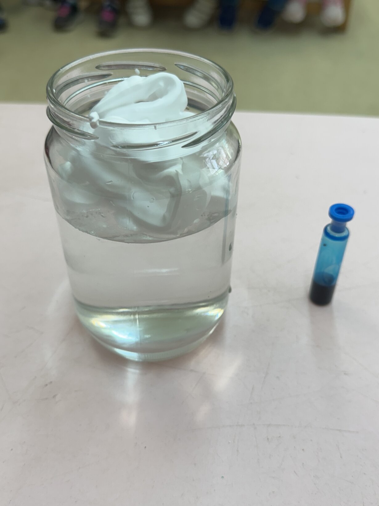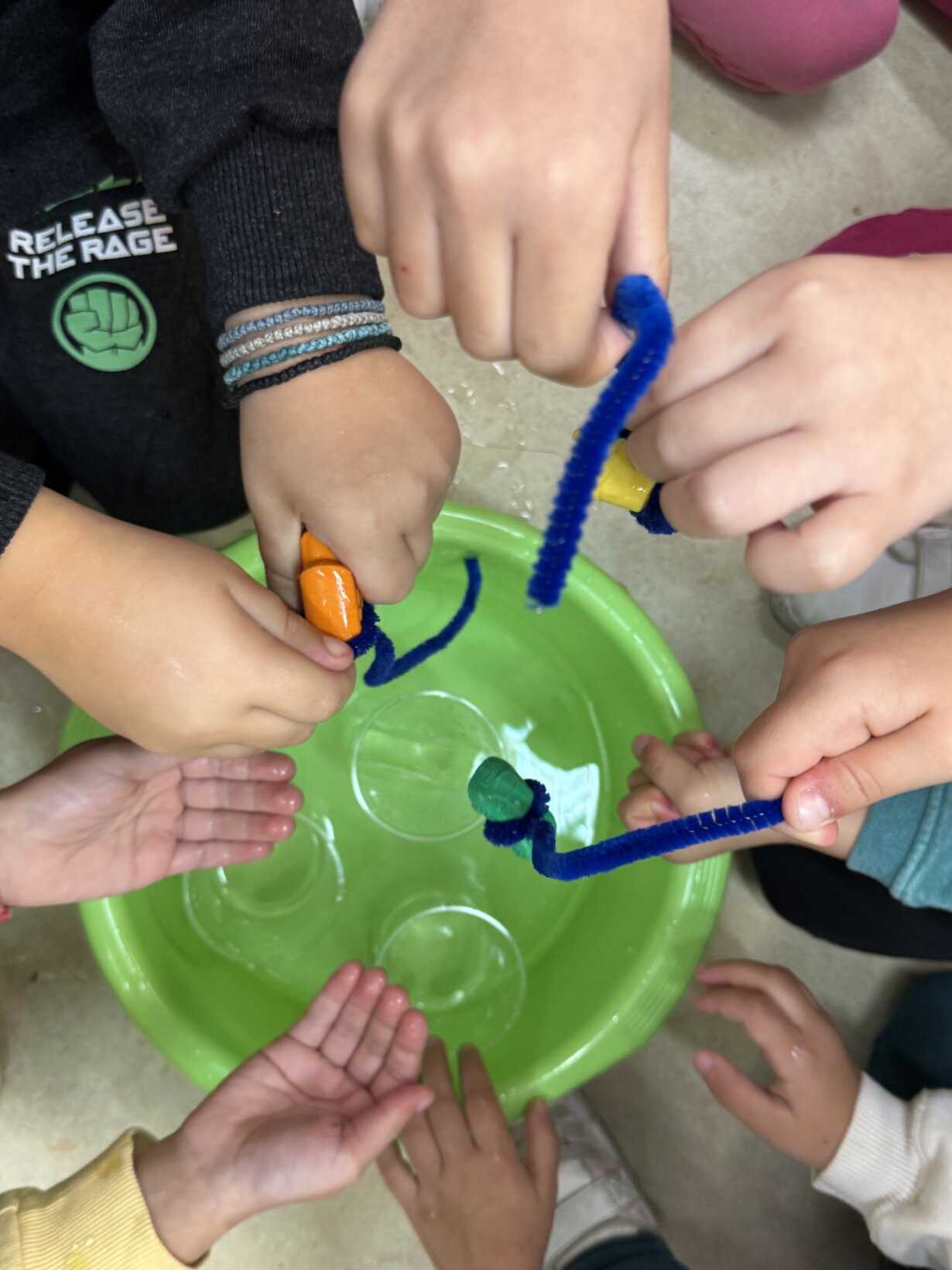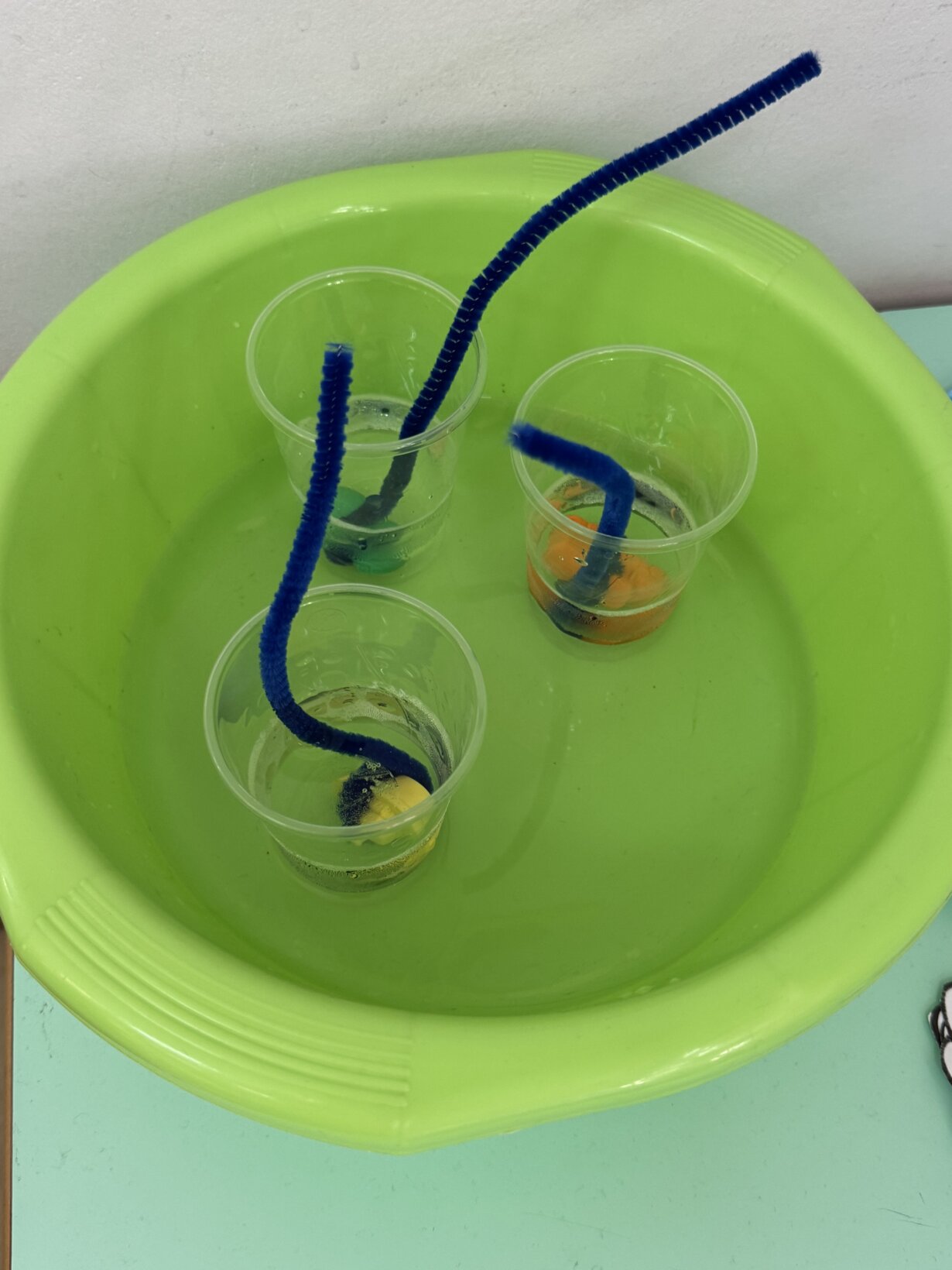 Μιλώντας για τις διάφορες μορφές που μπορεί να πάρει το νερό, βάλαμε νερό σε μικρά διάφανα ποτήρια κι εκεί μέσα βάλαμε και μικρά παιχνίδια της τάξης μας. Βάλαμε τα ποτήρια στην κατάψυξη και περιμέναμε την επόμενη ημέρα για να δούμε τι θα γίνει…