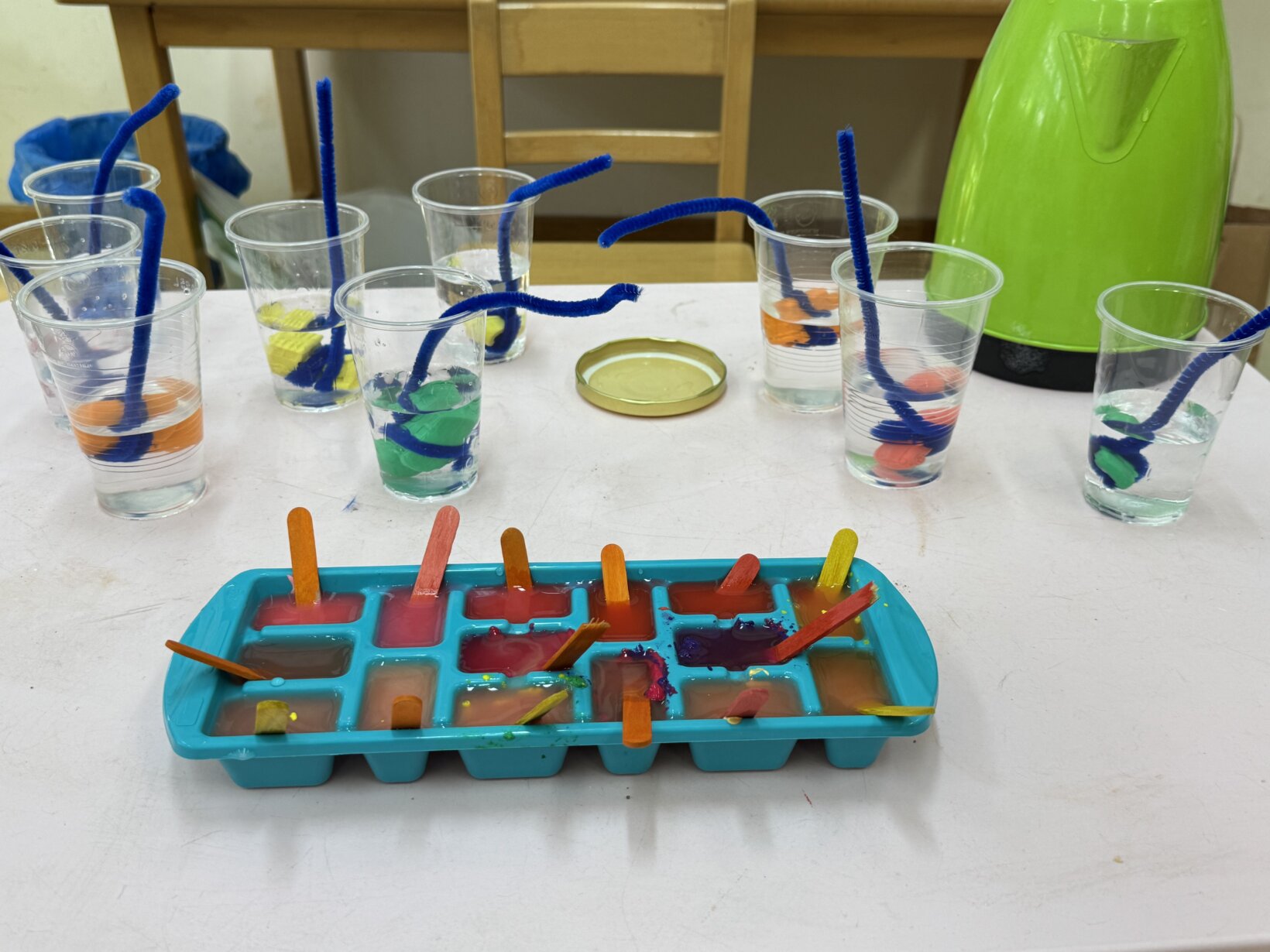 Ακομη, σε 2 παγοθήκες βάλαμε νερό και τέμπερα, ανακατέψαμε με ένα γλωσσοπίεστρο και τις βάλαμε στην κατάψυξη…