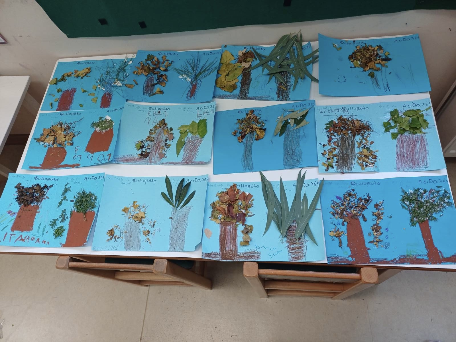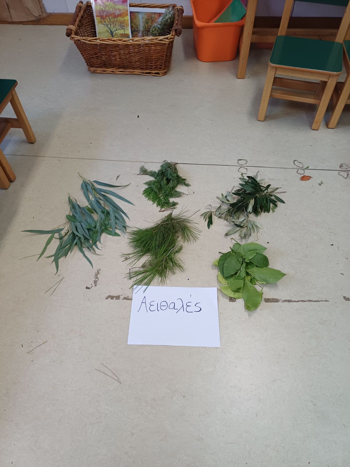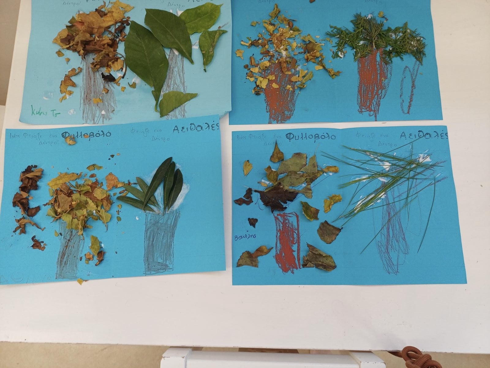 Μιλήσαμε για τα φυλλοβόλα κ Αειθαλή δέντρα και την κα Χλωροφύλλη. Παίξαμε θεατρικό παιχνίδι αφού διαλέξαμε τους ρόλους μας. Γνωρίσαμε, αγγίξαμε, μυρίσαμε, ταξινομήσαμε τα φύλλα με βάση το χρώμα, το σχήμα και το είδος δέντρου απο το οποίο προέρχονται αιτιολογώντας τις απόψεις μας . Τέλος, τα παιδιά εκφράστηκαν μέσα από την τέχνη. Βάψανε φθινοπωρινά φύλλα κ φτιάξανε κολλαζ με φυσικά υλικά κα που μαζέψανε από την αυλή του σχολείου!!!