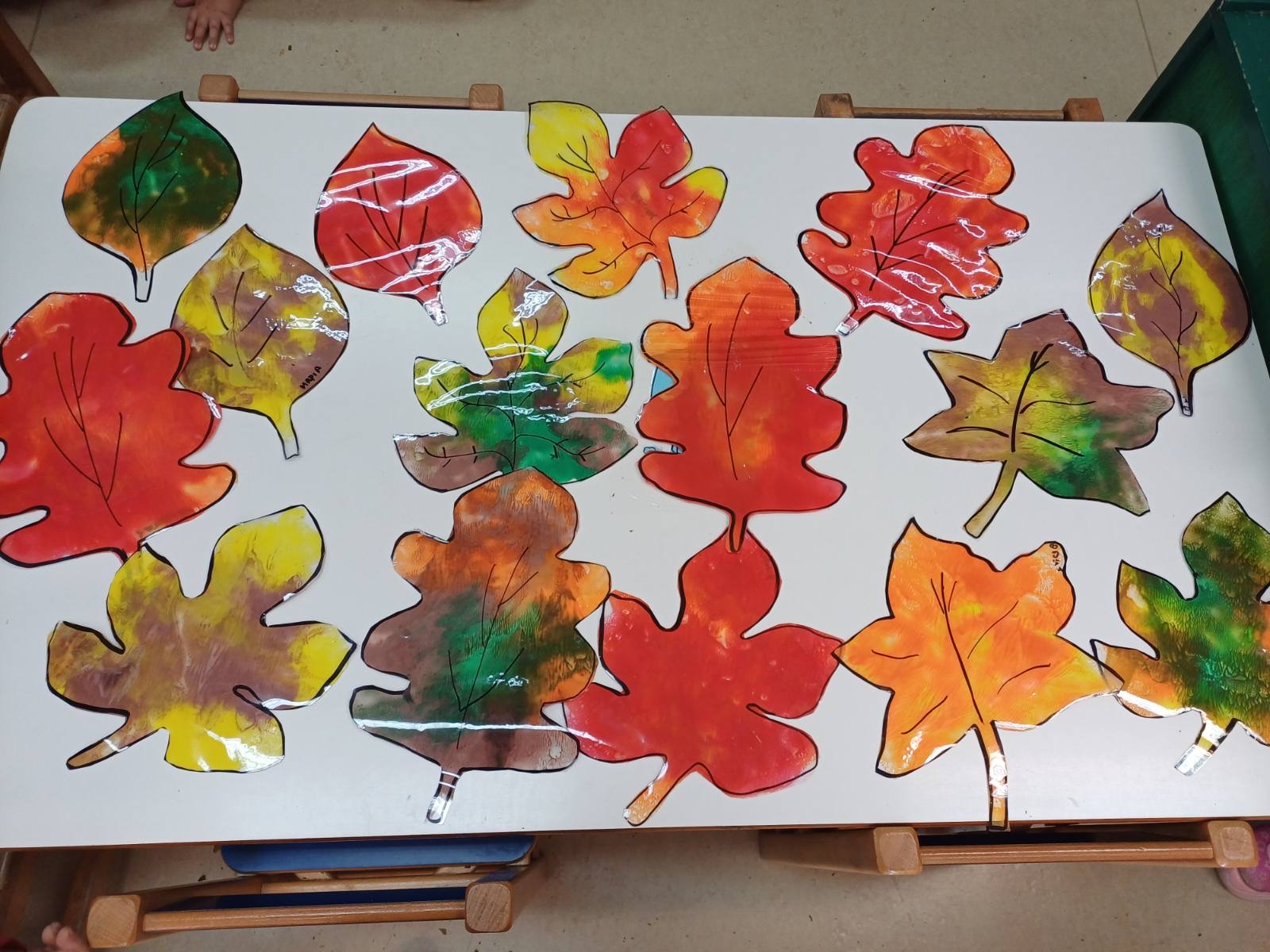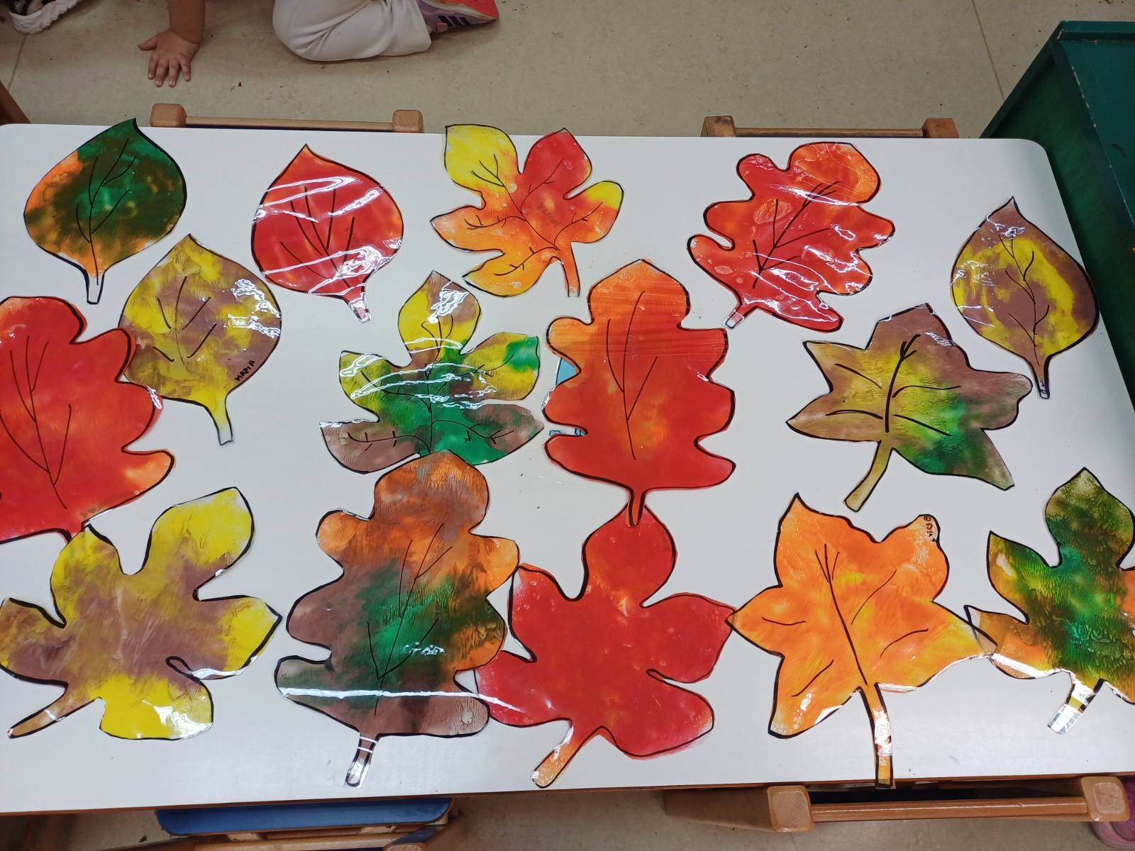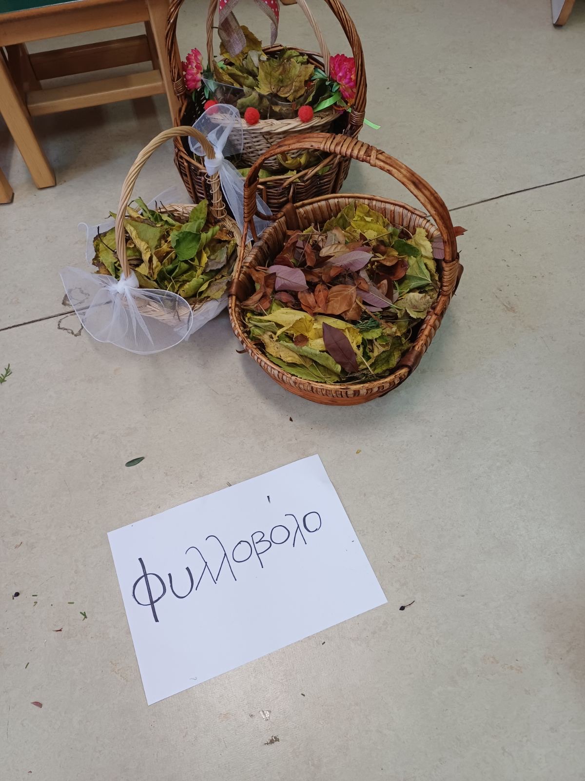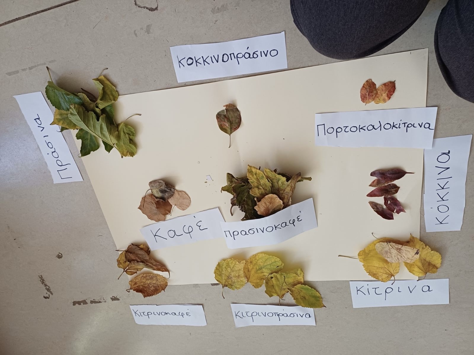 Μιλήσαμε για τα φυλλοβόλα κ Αειθαλή δέντρα και την κα Χλωροφύλλη. Παίξαμε θεατρικό παιχνίδι αφού διαλέξαμε τους ρόλους μας. Γνωρίσαμε, αγγίξαμε, μυρίσαμε, ταξινομήσαμε τα φύλλα με βάση το χρώμα, το σχήμα και το είδος δέντρου απο το οποίο προέρχονται αιτιολογώντας τις απόψεις μας . Τέλος, τα παιδιά εκφράστηκαν μέσα από την τέχνη. Βάψανε φθινοπωρινά φύλλα κ φτιάξανε κολλαζ με φυσικά υλικά κα που μαζέψανε από την αυλή του σχολείου!!!