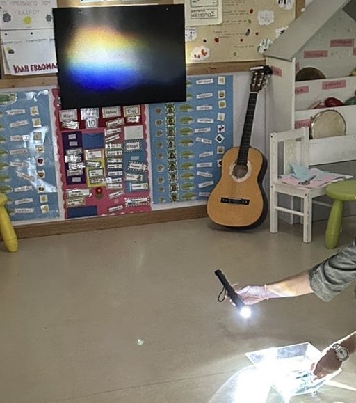 Σήμερα το πρωί έπιασε ξαφνικά δυνατή βροχή! Η τάξη μας έγινε σκοτεινή και εμείς άδραξαμε την ευκαιρία για να πραγματοποιήσουμε ένα πείραμα . Μόνο με λίγο νερό, ένα διάφανο δοχείο, καθρέφτη και φακό δημιουργήσαμε ένα τεχνητό ουράνιο τόξο. Αυτό το πείραμα επιτρέπει να επαναληφθεί το φαινόμενο του ουράνιου τόξου σε μικρότερη κλίμακα και βοηθάει στην κατανόηση απο τα παιδιά των αρχών της διάθλασης και της ανάλυσης του φωτός.