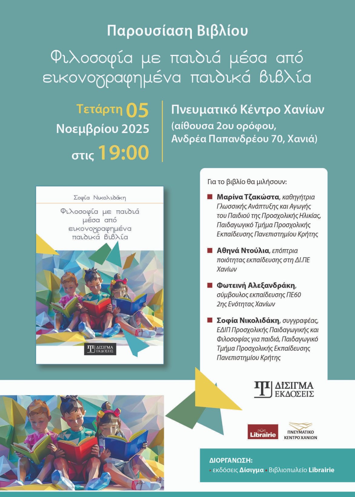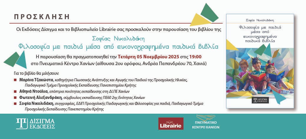 Με μεγάλη χαρά σας προσκαλούμε την Τετάρτη 5 Νοεμβρίου στις 7 μ.μ. στο Πνευματικό Κέντρο Χανίων στην παρουσίαση του βιβλίου «Φιλοσοφία με παιδιά μέσα από εικονογραφημένα παιδικά βιβλία» της Σοφίας Νικολιδάκη, ΕΔΙΠ Προσχολικής Παιδαγωγικής και Φιλοσοφίας για παιδιά, Παιδαγωγικό Τμήμα Προσχολικής Εκπαίδευσης Πανεπιστημίου Κρήτης.