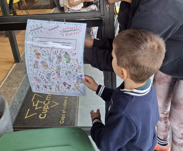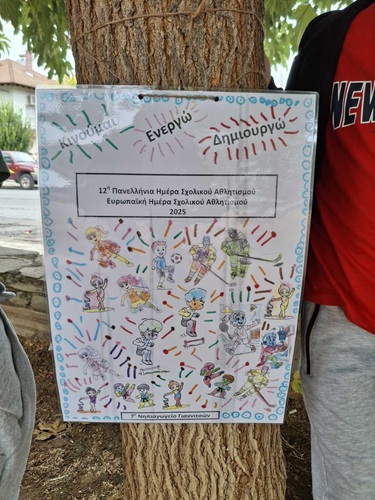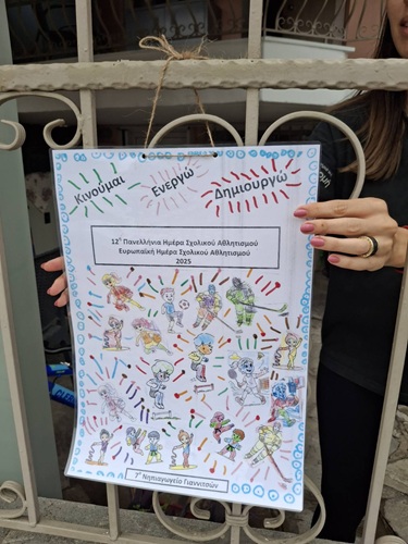 Με αφορμή την 12η Πανελλήνια Ημέρα Σχολικού Αθλητισμού, το Νηπιαγωγείο μας οργάνωσε μια όμορφη και συμμετοχική δράση που έφερε πιο κοντά τα παιδιά με τους γονείς και την τοπική κοινότητα. Η δημιουργία αφίσας και η τοποθέτησή της σε τοίχο (τοιχοκόλληση σε 4 σημεία της γειτονιάς) με στόχο την παρακίνηση των ενηλίκων να ασκηθούν, ήταν μια εξαιρετική δράση που συνέδεσε το νηπιαγωγείο με την ευρύτερη κοινότητα (γονείς, εκπαιδευτικούς, πολίτες). Σκοπός της αφίσας ήταν να μεταφέρει το μήνυμα ότι η άσκηση δεν έχει ηλικία. να δείξει πως τα παιδιά παρά το μικρό της ηλικίας τους, μπορούν να δώσουν το καλό παράδειγμα στους μεγάλους και να τους παρακινήσουν να γυμναστούν. Ήταν μια μέρα χαράς, συνεργασίας και κινητοποίησης, όπου παιδιά και γονείς έγιναν ενεργοί πολίτες και πρεσβευτές της υγιεινής ζωής. Ευχαριστούμε θερμά όλους τους γονείς που συμμετείχαν και στήριξαν με χαρά και ενθουσιασμό τη δράση μας για την 12η Πανελλήνια Ημέρα Σχολικού Αθλητισμού. Η παρουσία και η βοήθειά σας ήταν πολύτιμη για την υλοποίηση της δραστηριότητας και έστειλε ένα δυνατό μήνυμα συνεργασίας, ενεργής συμμετοχής και αγάπης για την άσκηση και την υγεία.