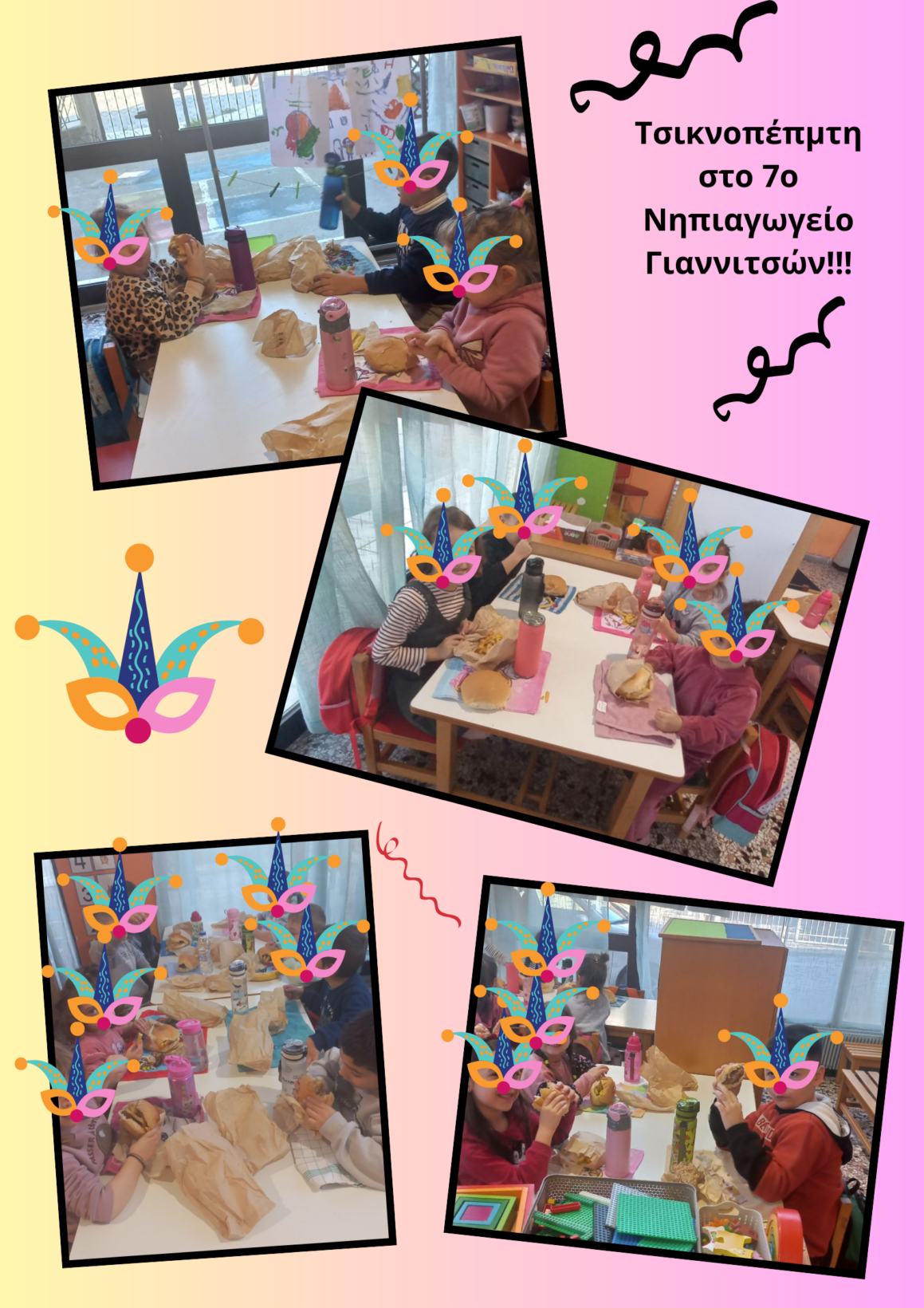 Σήμερα, στο εκπαιδευτικό μας πρόγραμμα, εντάχθηκε το έθιμο της Τσικνοπέμπτης με κέφι, φαγητό και χορό με το παραδοσιακό γαϊτανάκι. Θα θέλαμε να ευχαριστήσουμε ιδιαιτέρως όλους εκείνους τους γονείς που συνέβαλαν με το τρόπο τους να πραγματοποιηθεί το γαστρονομικό μέρος της γιορτής.