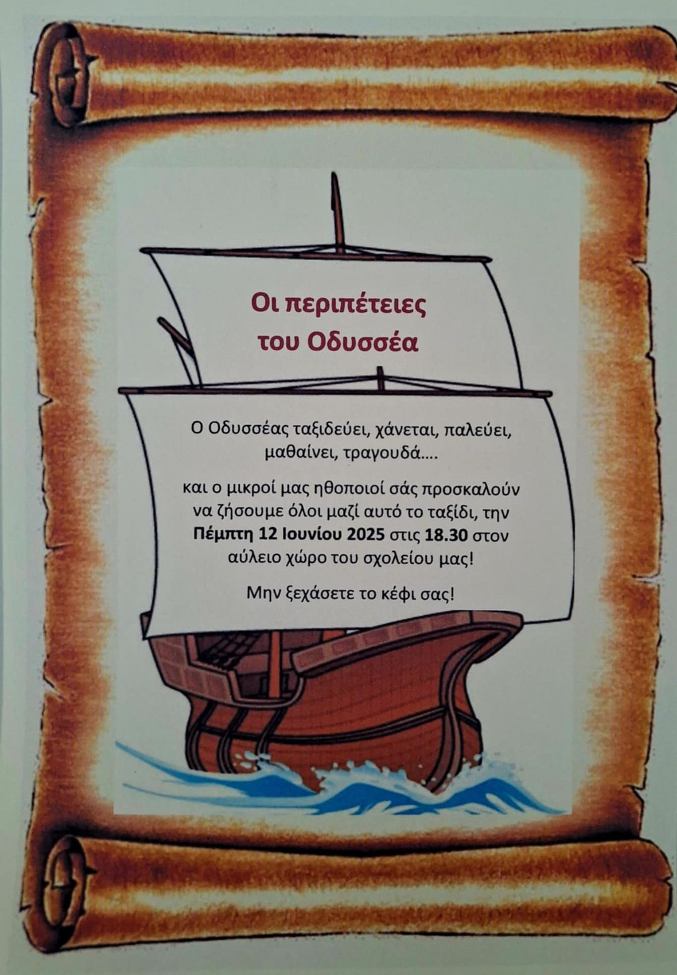 Σε κλίμα χαράς και συγκίνησης πραγματοποιήθηκε η γιορτή λήξης για τη φετινή σχολική χρονιά. Τα νήπιά μας, μέσα από θεατρικό παιχνίδι, μουσική και κίνηση ταξίδεψαν τους καλεσμένους μας και με τις «Περιπέτειες του Οδυσσέα» ζωντάνεψαν σκηνές από τη συναρπαστική Οδύσσεια. Από τα τερτίπια των Ολύμπιων Θεών στη χώρα των Λωτοφάγων, στους Κύκλωπες και τις μαγευτικές Σειρήνες, κι από τη μάγισσα Κίρκη μέχρι την επιστροφή στην Ιθάκη, τα παιδιά έδωσαν τον καλύτερό τους εαυτό, γεμίζοντας τη σκηνή με εικόνες, φαντασία και χαμόγελα!